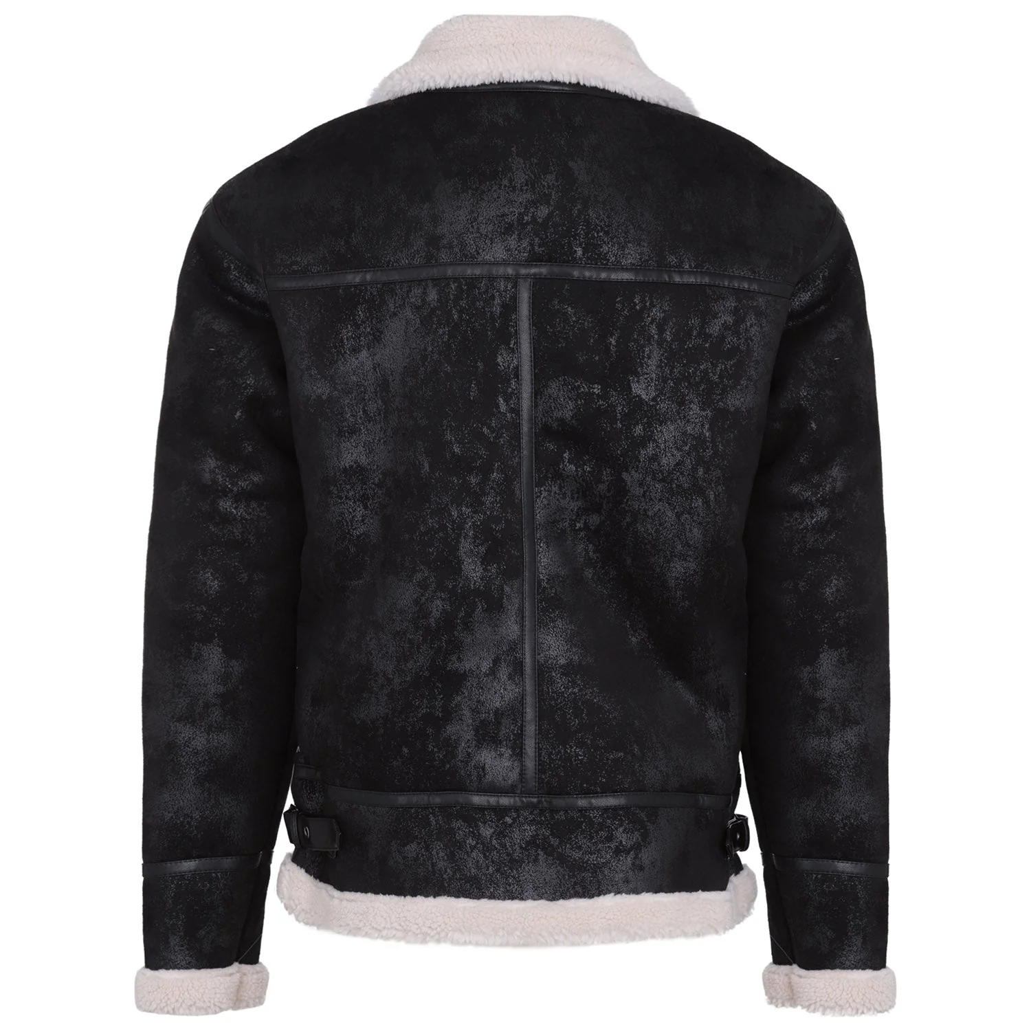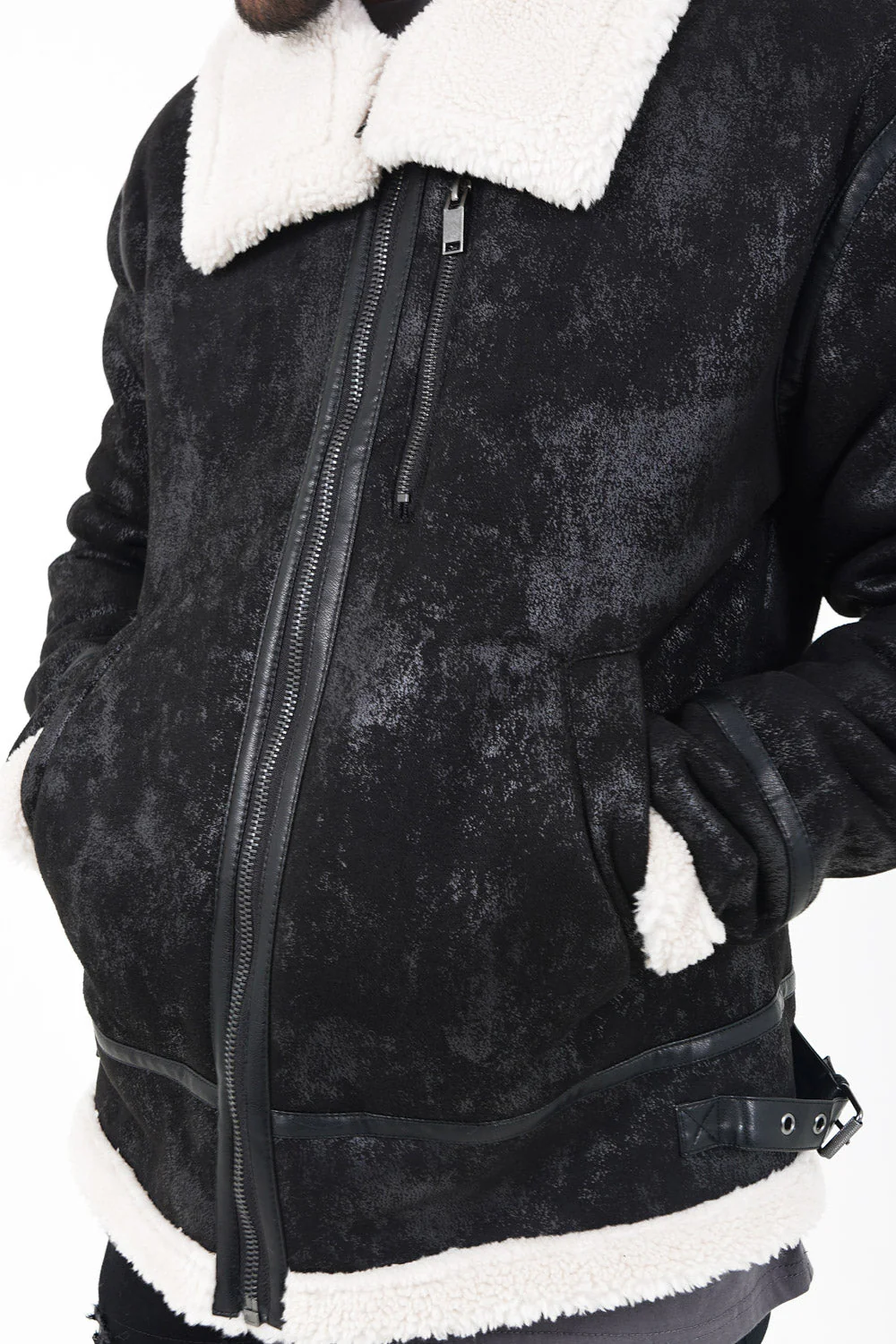 Style aviateur avec col à revers en sherpa, bande aux poignets et à la taille en sherpa. Détails avec bandes en simili cuir sur le buste et les manches, fermeture centrale à zip, poches latérales avant.
