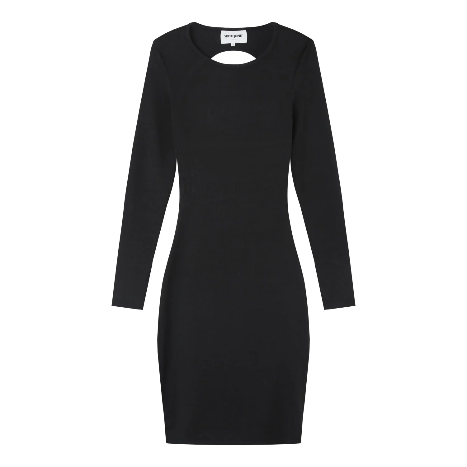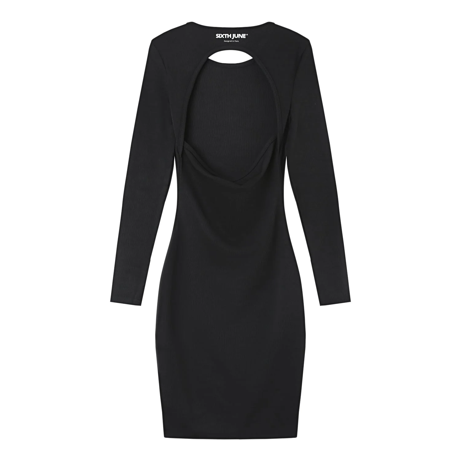 Robe à manches longues pour femme de marque Sixth June. Ouverture dans le haut du dos. Matière fine et légèrement côtelée, logo printé à l’arrière au niveau du col. Coupe moulante, courte.