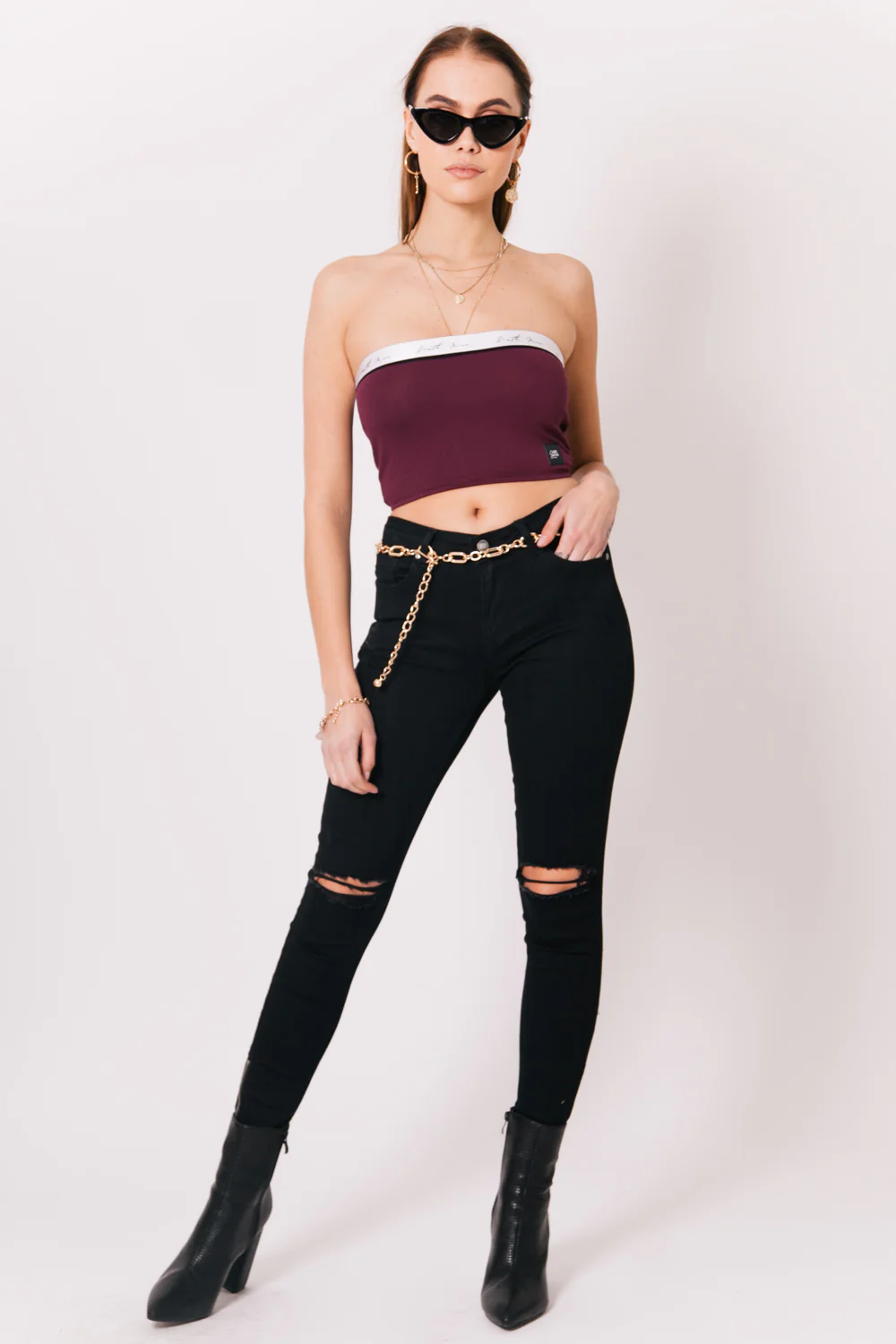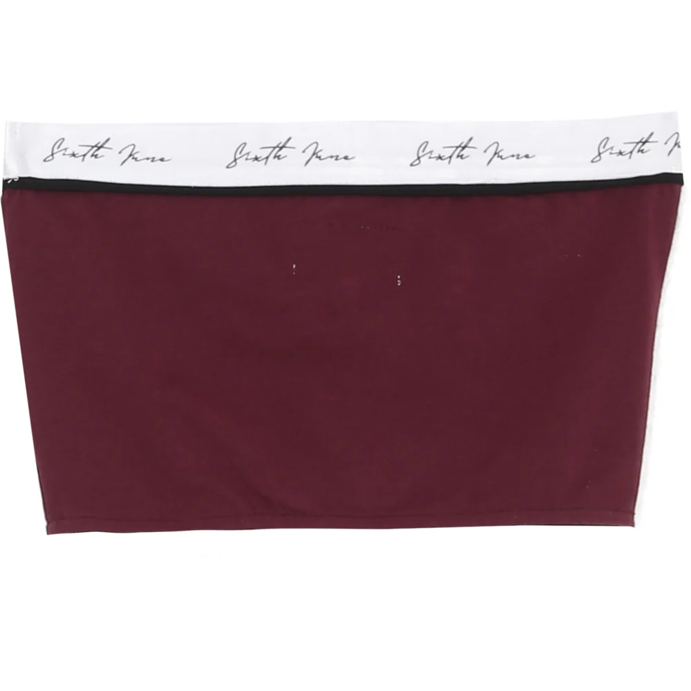 Bandeau Sixth June pour femme avec bande griffée. Coupe moulante très près du corps, sans bretelles et bonnets non rembourrés. Modèle rouge bordeaux avec bande blanche.