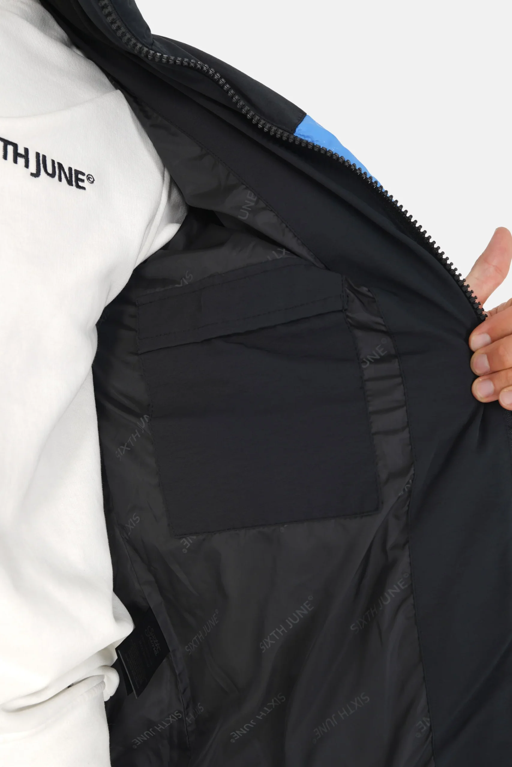 Poches latérales avec fermeture à zip, fermeture centrale à zip également, col montant, élastique aux poignets et pattes de serrage à scratch, poche intérieur, patch tissé Sixth June au dos près de la nuque, doublure (100% polyester), ne pas essorer en machine.