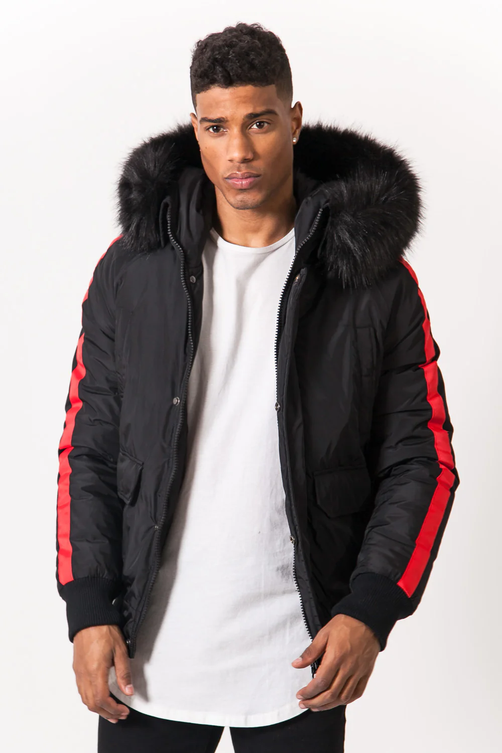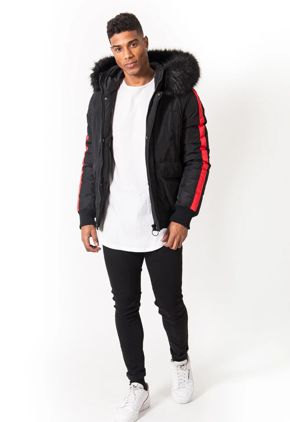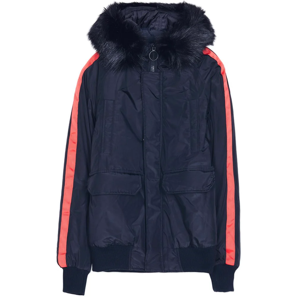 Blouson Sixth June pour homme avec des bandes le long des manches et une capuche dotée d’une fourrure amovible. Coupe ajustée et courte, bords-côtes au niveau de la base et des manches, poches latérales, poches poitrine, poche intérieur, fermeture zippée et boutonnée. Modèle noir avec bandes rouges.