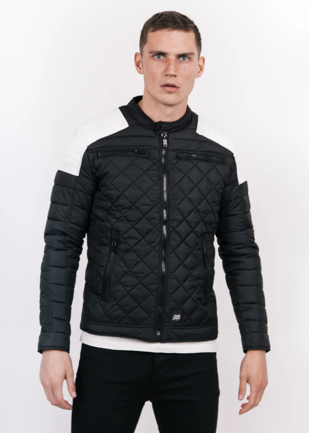 Blouson matelassé homme Sixth June avec empiècements biker au niveau des épaules. Coupe très ajustée (près du corps), deux poches latérales zippées, poche inétrieure, deux poches poitrines zippées, fermeture à zip et boutons à pression au col. Modèle noir avec empiècements blancs.