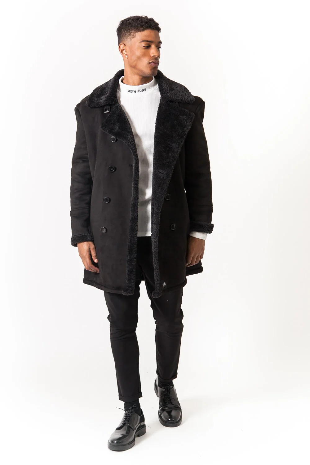 Caban pour homme de marque Sixth June. Matière en suédine, douche et chaude avec intérieur en fausse peau de mouton. Col à revers, double patte de boutonnage. Poches latérales et fonctionnelles. Coupe classique. Modèle noir, doublure (100% polyester).