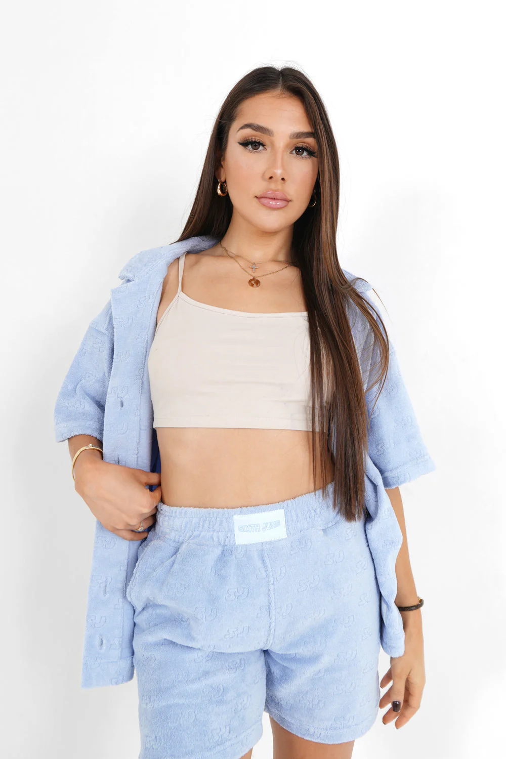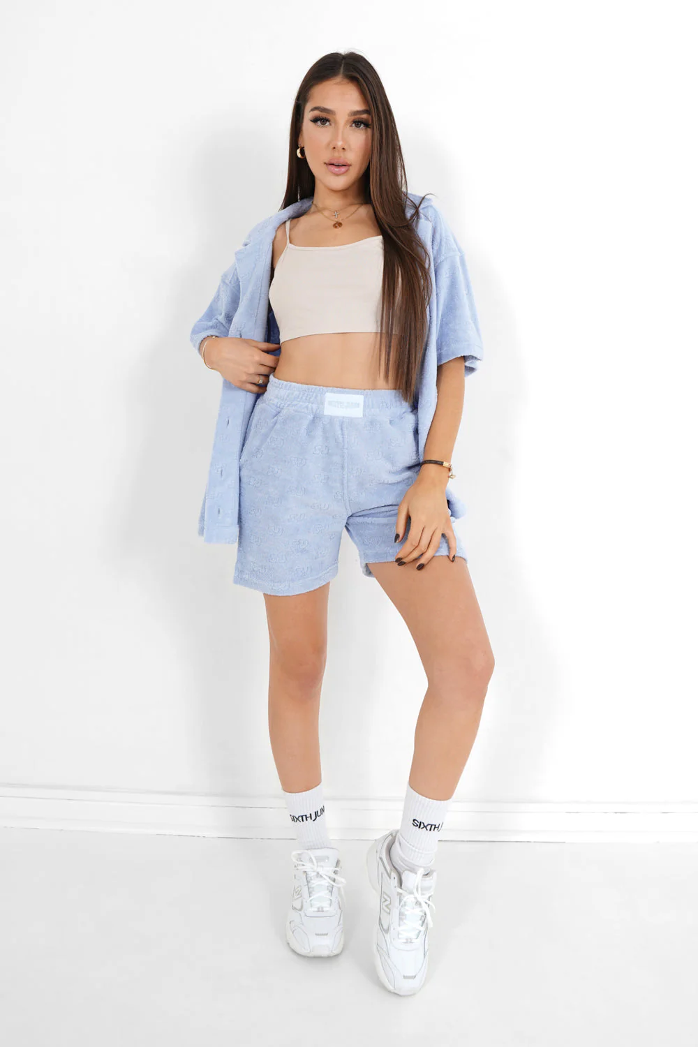 Chemise à manches courtes pour femme de marque Sixth June. Matière effet serviette de plage avec les initiales SJ en relief sur l’ensemble du tissu. Fermeture centrale à boutons, logo tissé sur patch à l’avant. Coupe classique. Composition: coton (70%) – polyester (30%). Imprimé: non. Motif: uni. Col: polo, chemise. Manches: courtes.