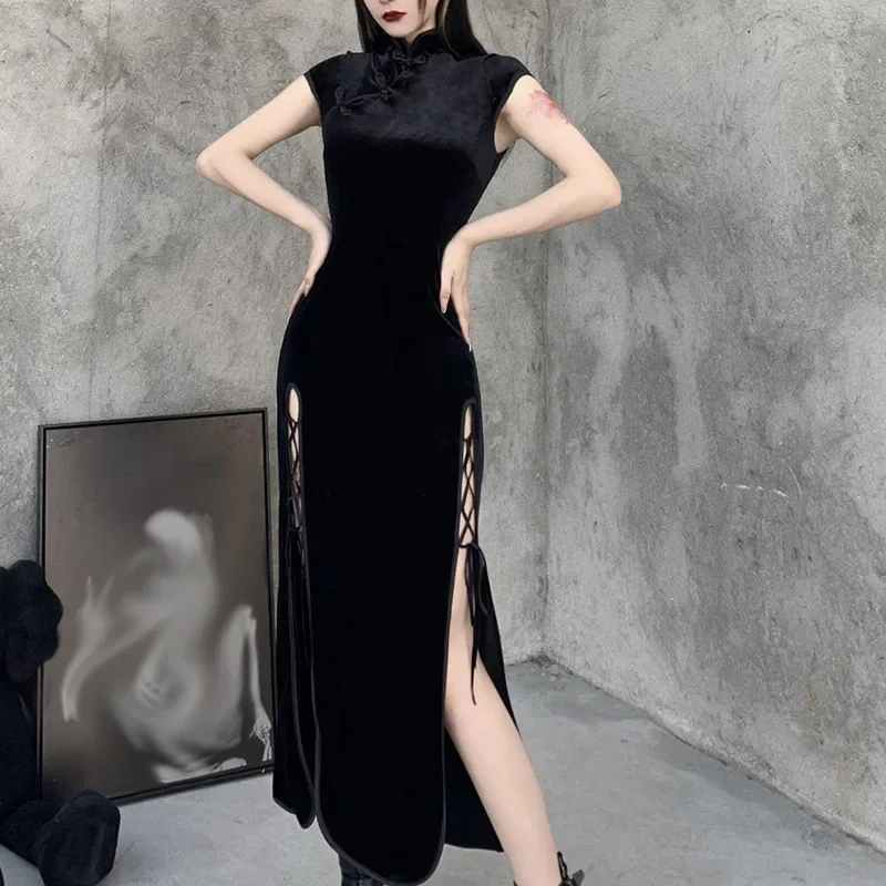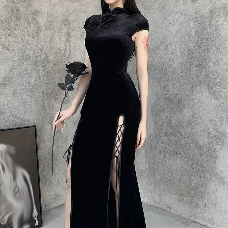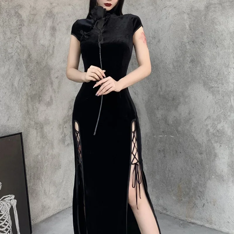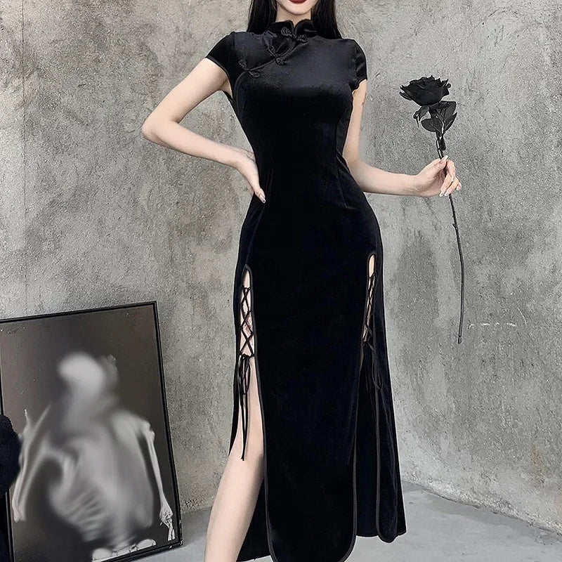 La Cheongsam Robe Gothique Fendue incarne la rencontre parfaite entre le chic élégant et l’audace rebelle. Ce modèle unique se distingue par son allure envoûtante qui attire tous les regards. Conçue avec soin et une grande attention aux détails, elle est l’essence même du style gothique, tout en gardant une élégance intemporelle. Chaque femme cherchant à exprimer sa personnalité et à affirmer son style trouvera dans cette robe un atout majeur de sa garde-robe.