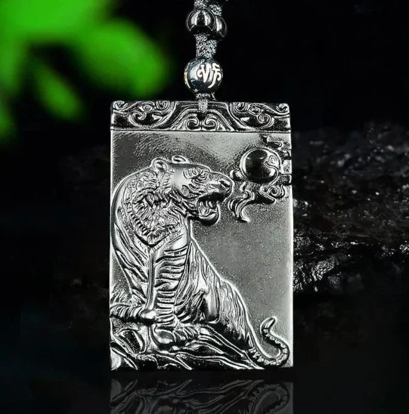 Collier Chinois en Obsidienne Noire avec Pendentif en Forme de Tigre