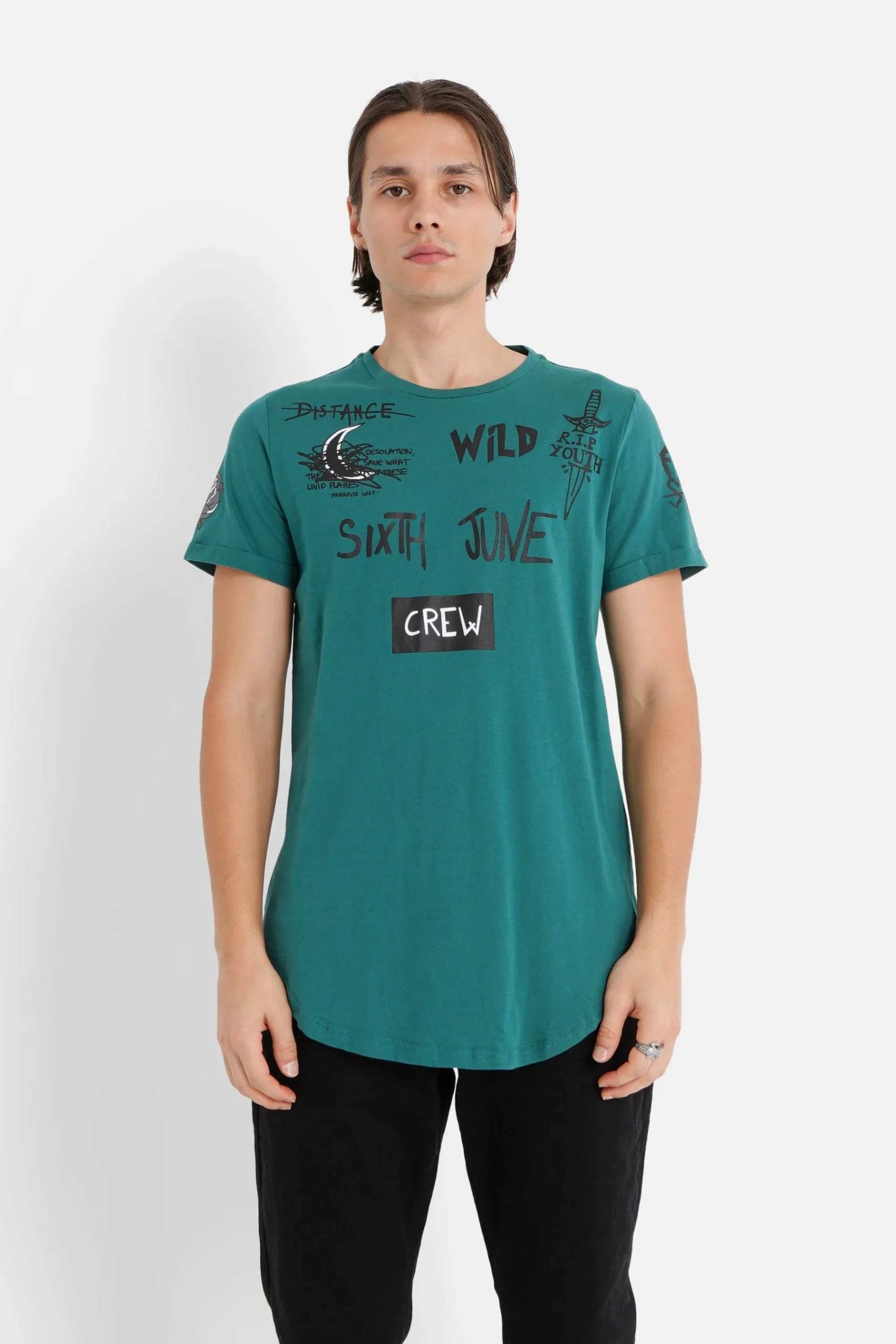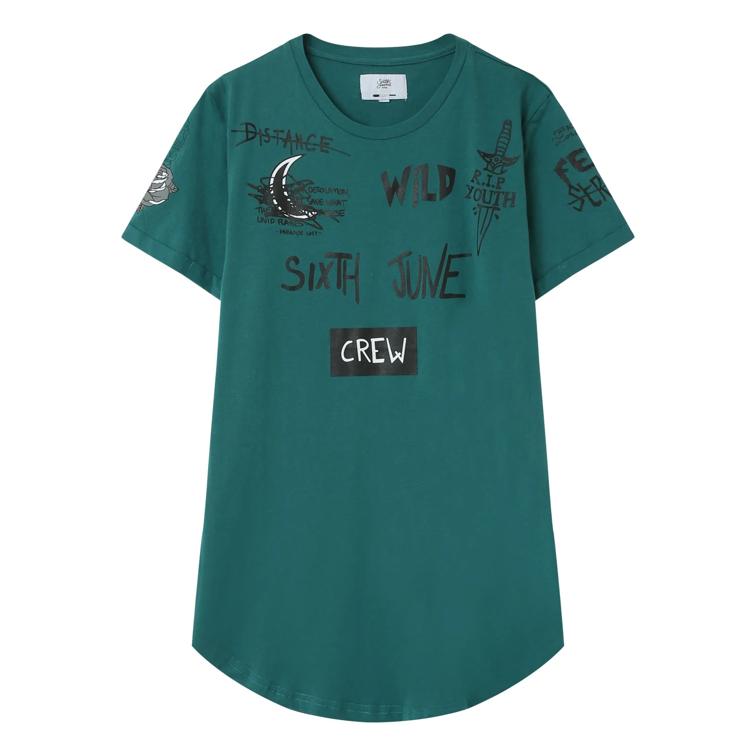 Inscriptions et motifs à l’avant (crew, wild, Sixth June), inscription « CREW » à l’arrière, base arrondie, col rond.