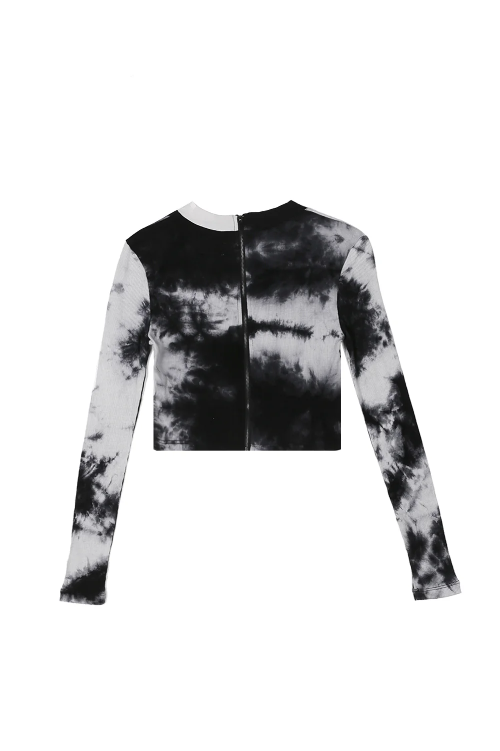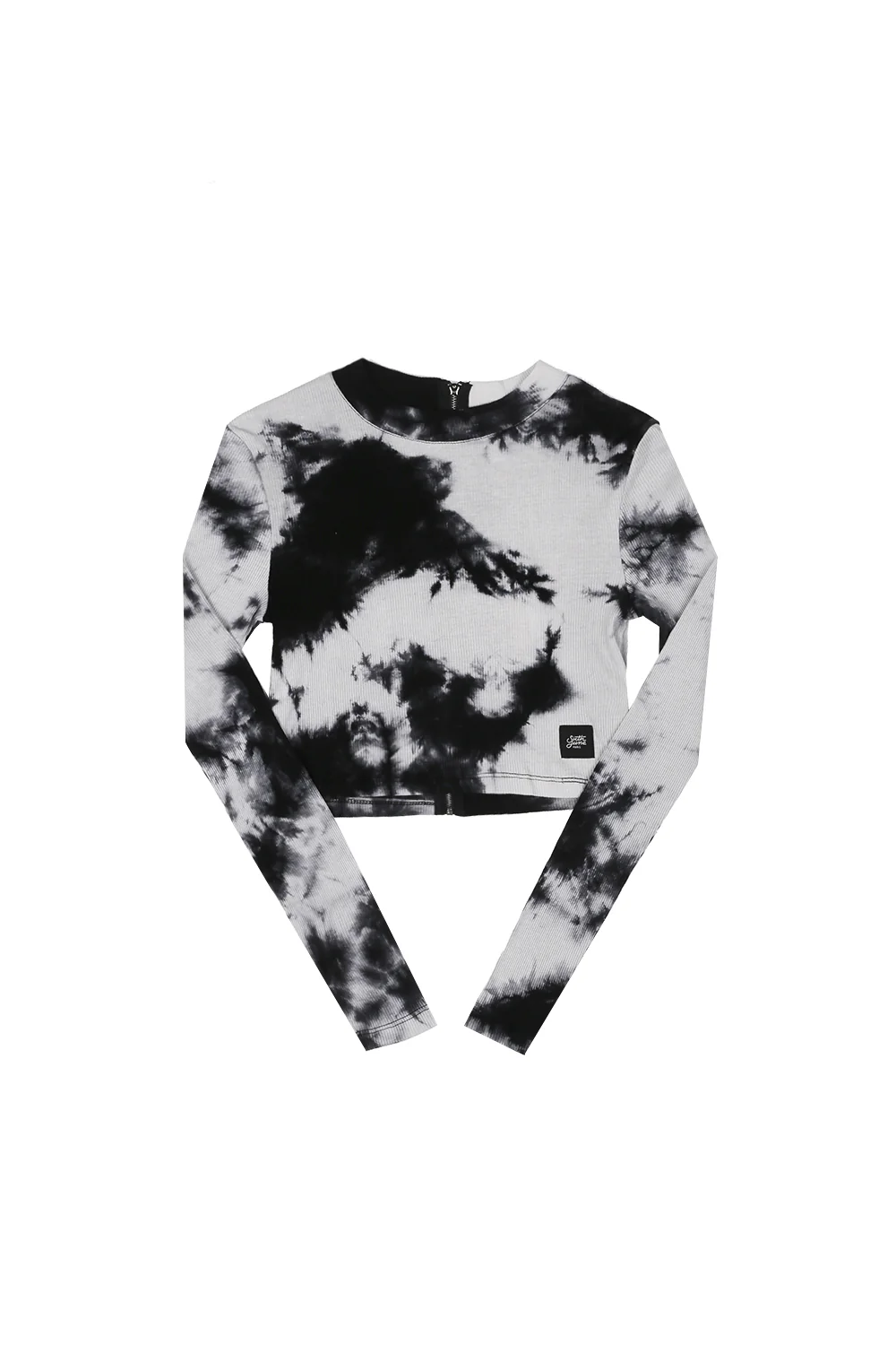 T-shirt court gris et noir Sixth June Femme. Manches longues. Effet tie & dye. Col montant. Zip dans le dos.