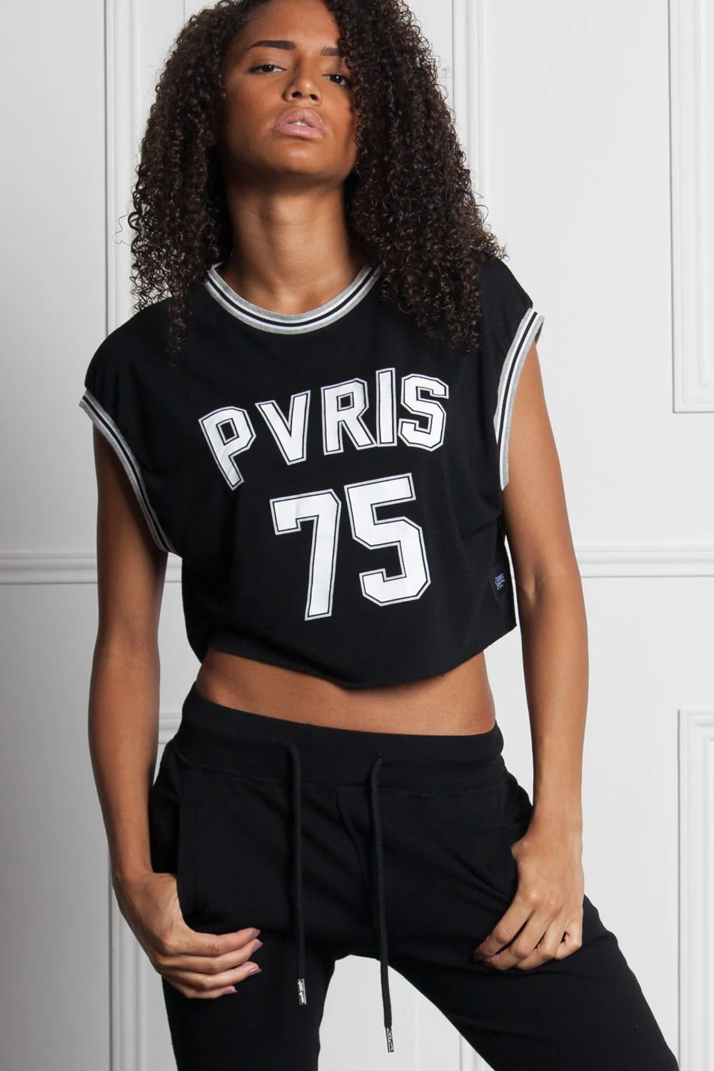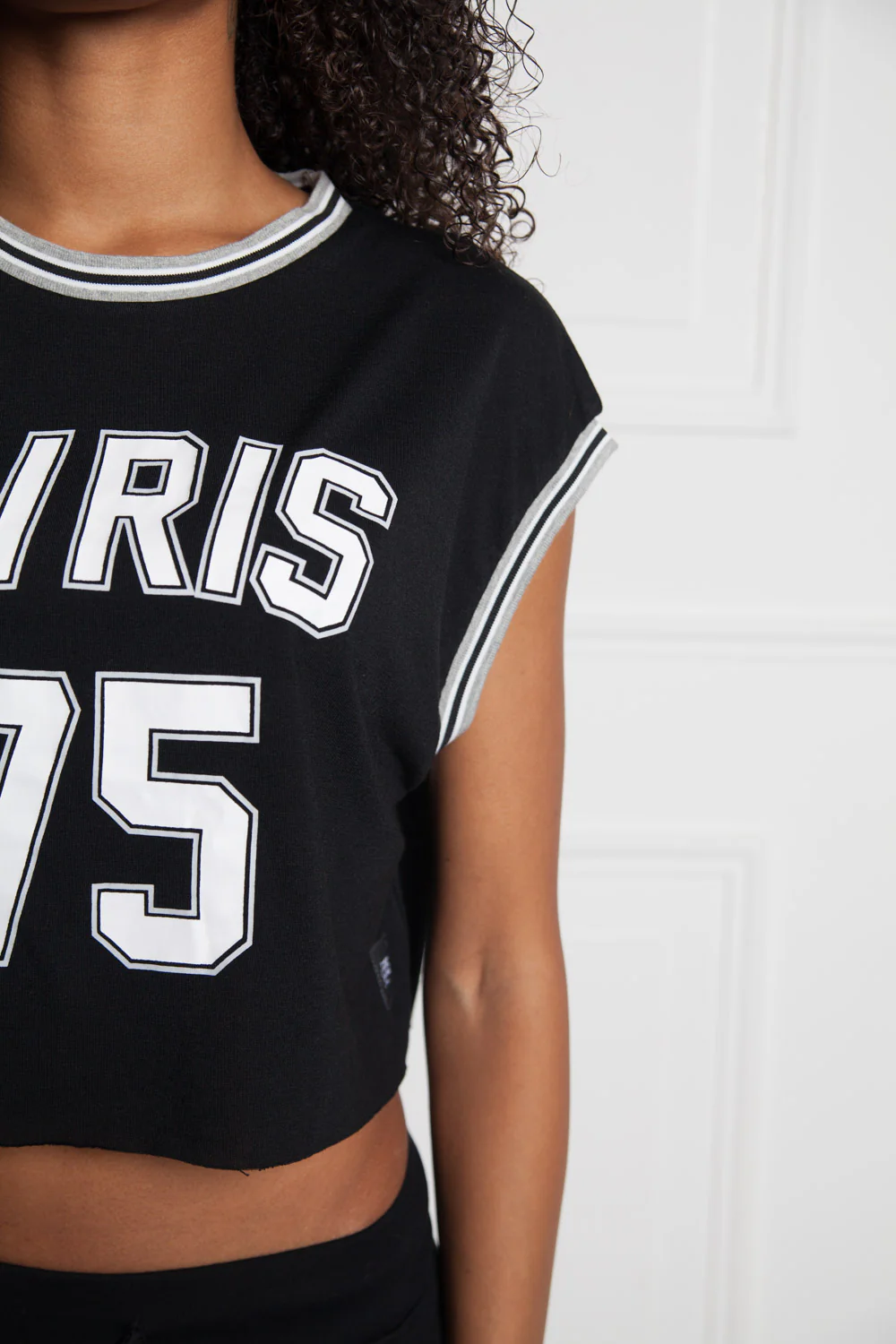 Crop top noir Sixth June Femme. Inscription Pvris 75, à l’avant. Inspiration maillot de basket.