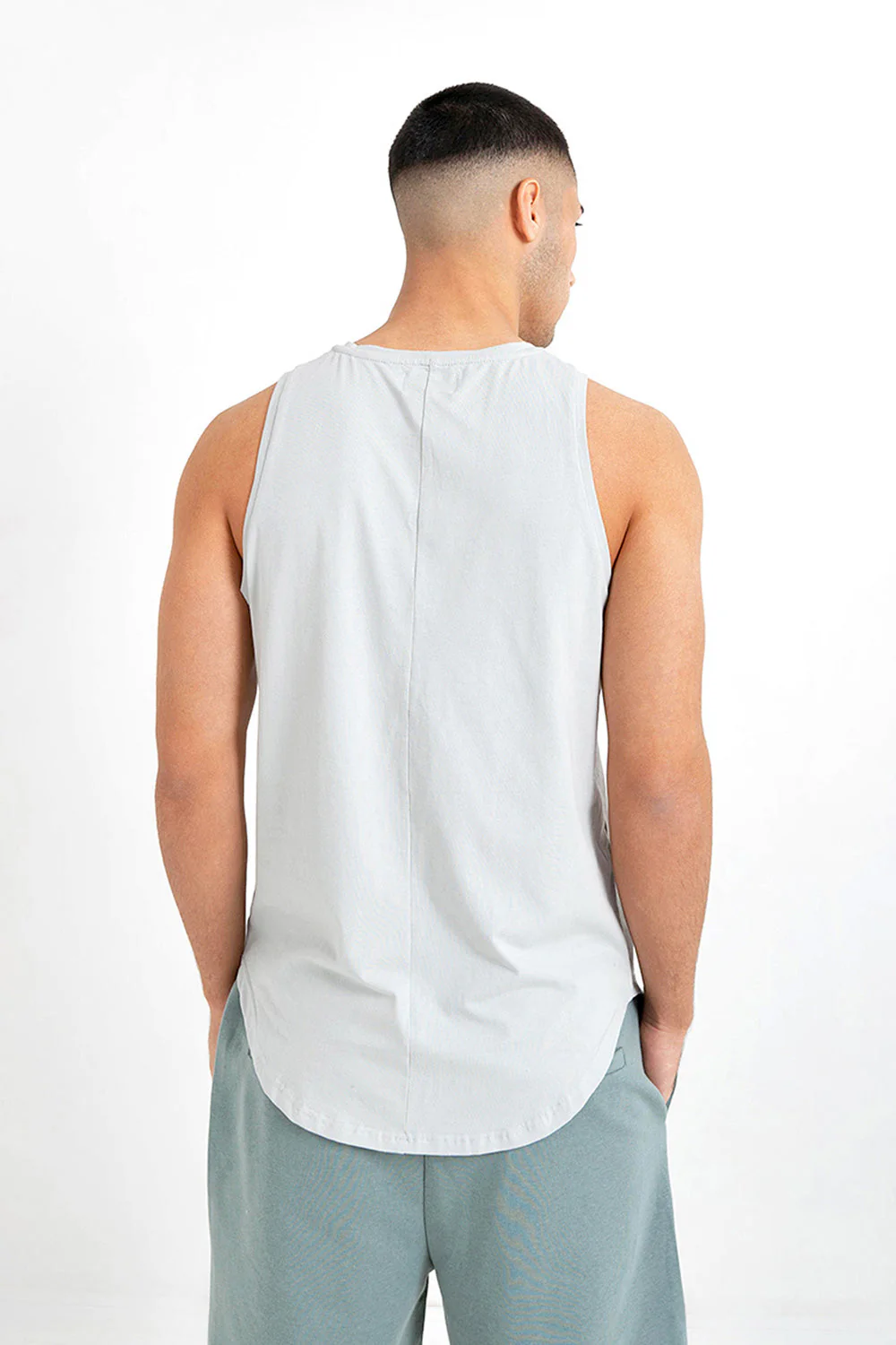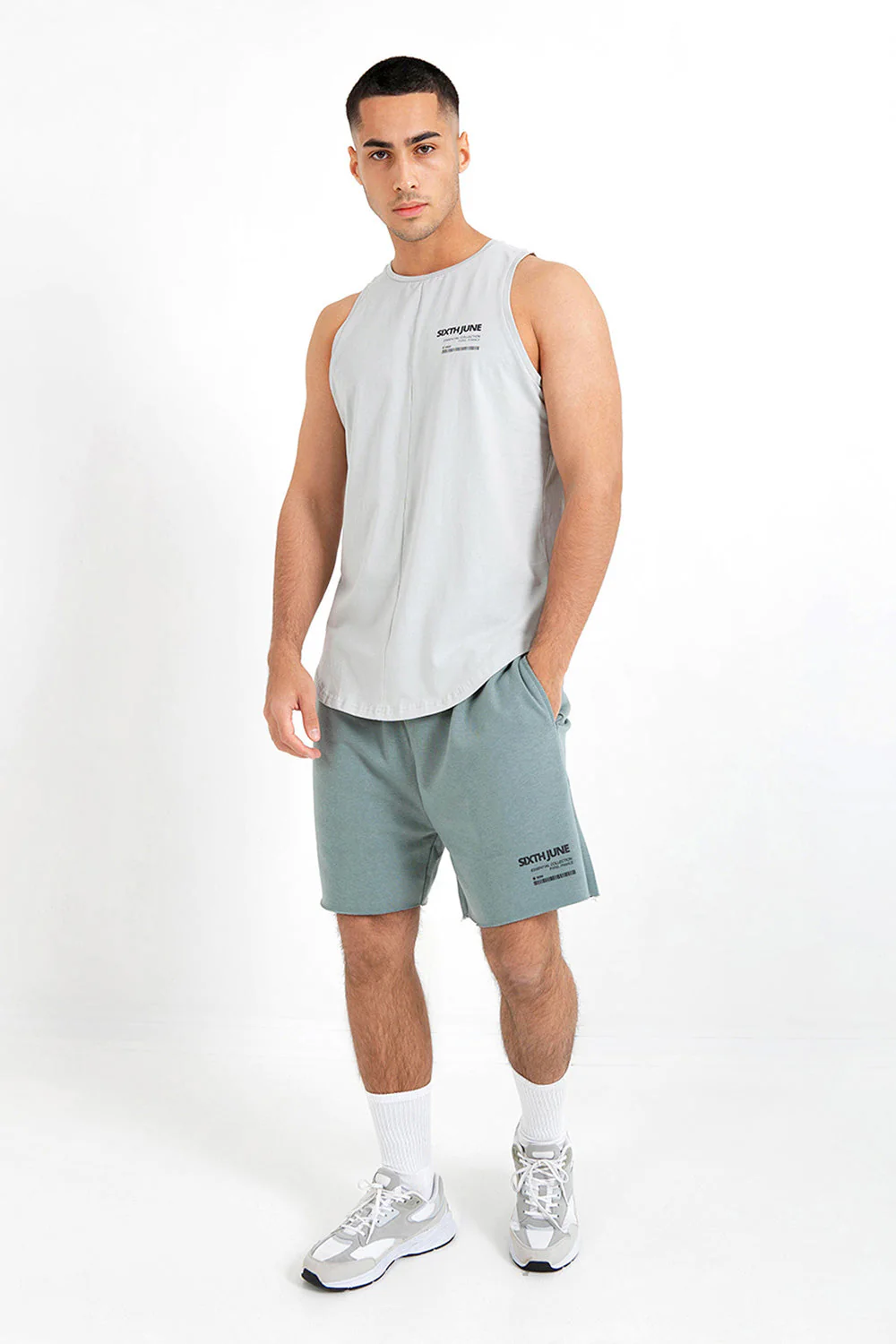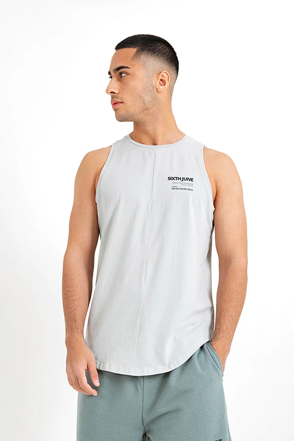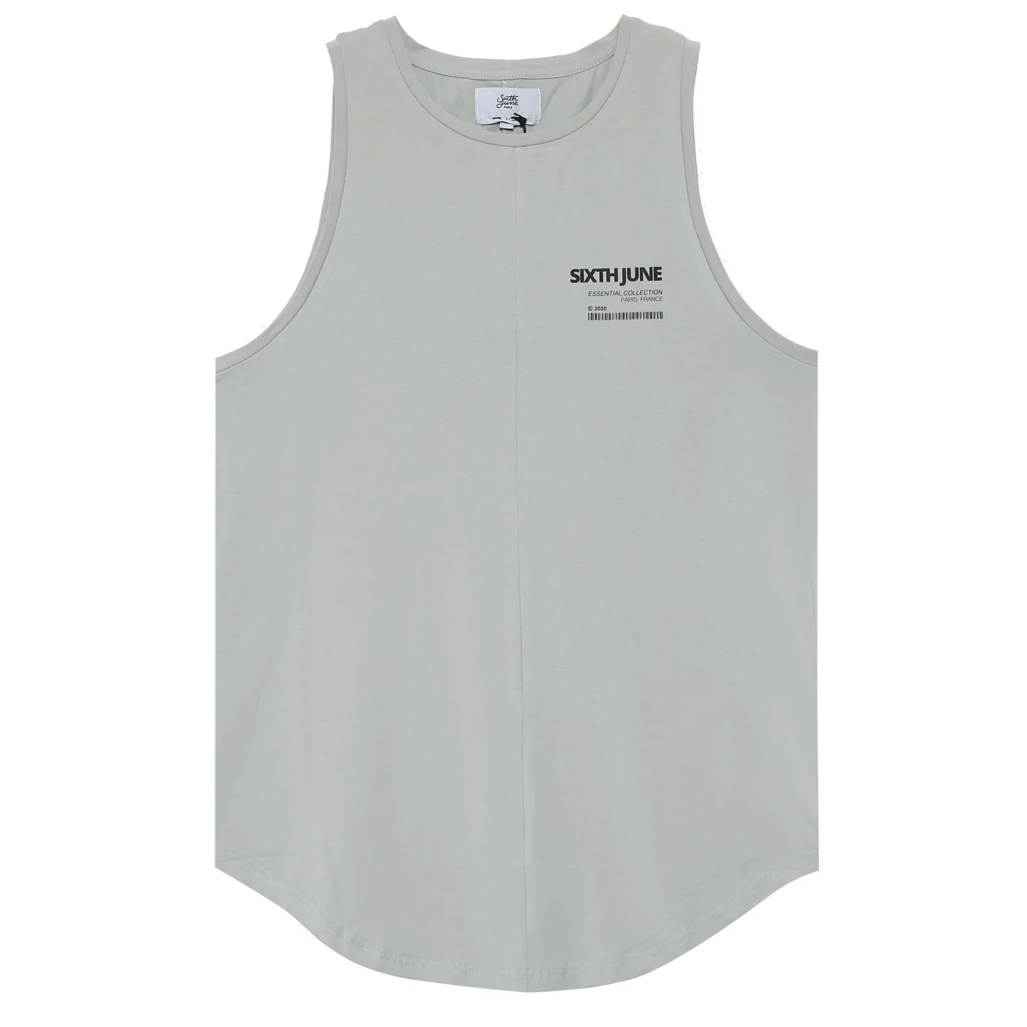 T-shirt sans manches pour homme de marque Sixth June. Inscription avec un code-barres et texte: Essential Collection, Paris, à l’avant. Matière stretch, base arrondie. Coupe longue et cintrée. Modèle vert d’eau. Composition: coton (100%) . Imprimé: non. Motif: uni. Col: rond. Longueur: standard. Manches: sans.