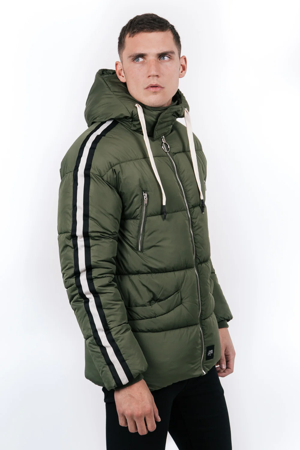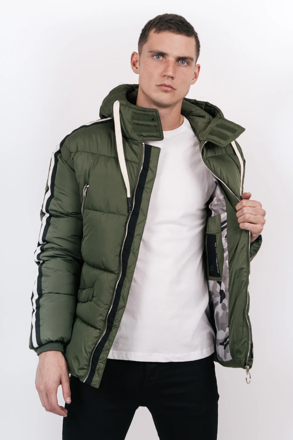 Doudoune épaisse Sixth June pour homme avec des bandes le long des manches. Coupe classique, capuche (non amovible) avec cordons de serrage, col avec fermeture scratch, fermeture zippée, doublure imprimée camouflage, poche intérieure, poches zippées au niveau de la poitrine et poches latérales. Modèle vert kaki avec bandes bicolores noires et blanches.