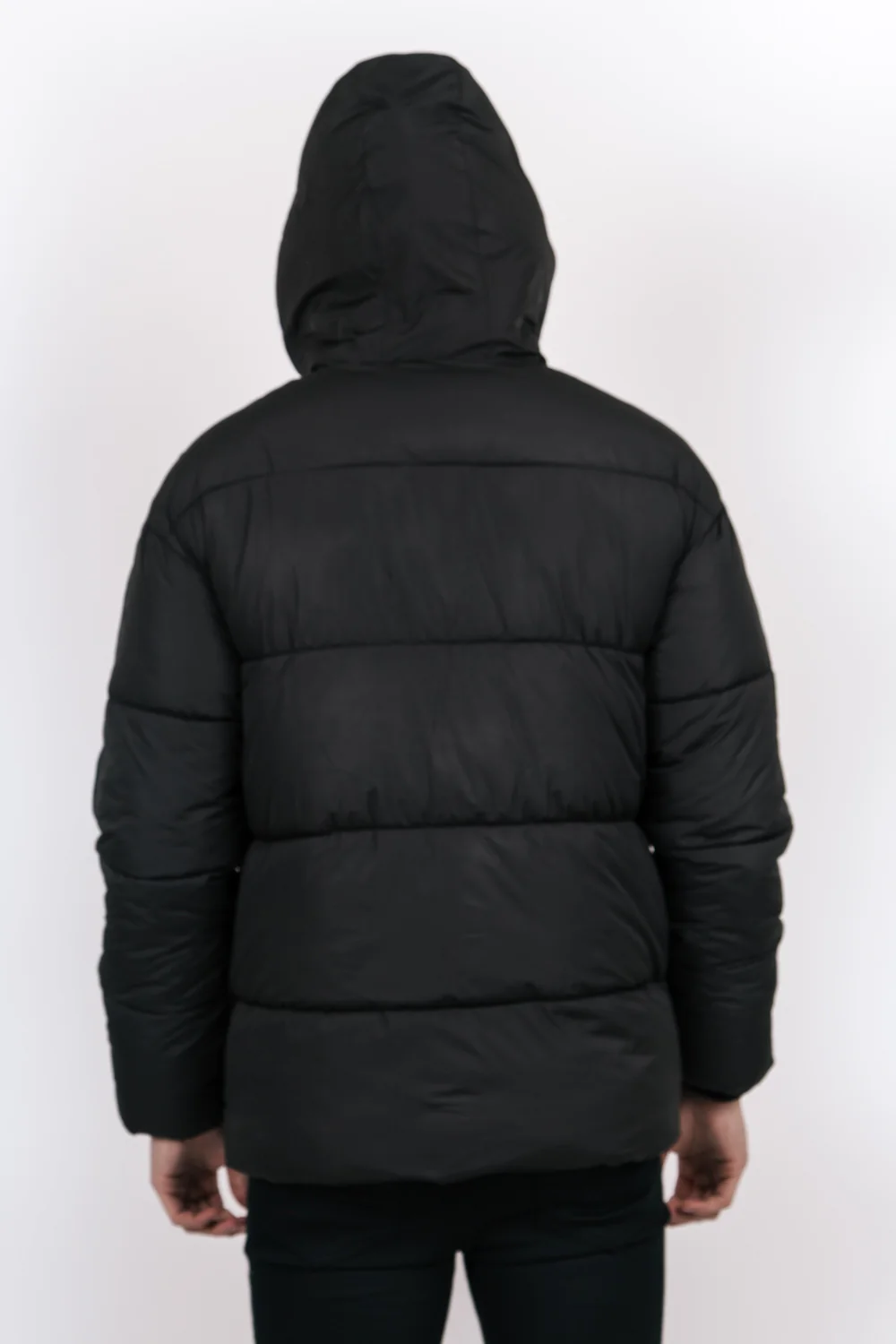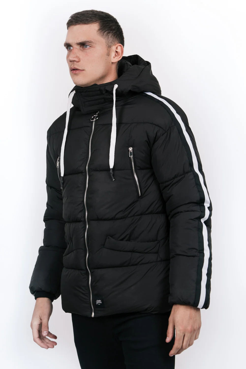 Doudoune épaisse Sixth June pour homme avec des bandes le long des manches. Coupe classique, capuche (non amovible) avec cordons de serrage, col avec fermeture scratch, fermeture zippée, poche intérieure, poches zippées au niveau de la poitrine et poches latérales. Modèle noir avec bandes noires et blanches.