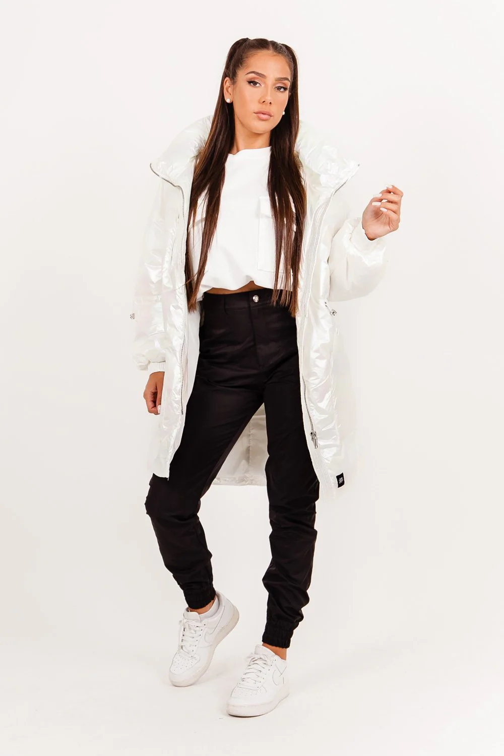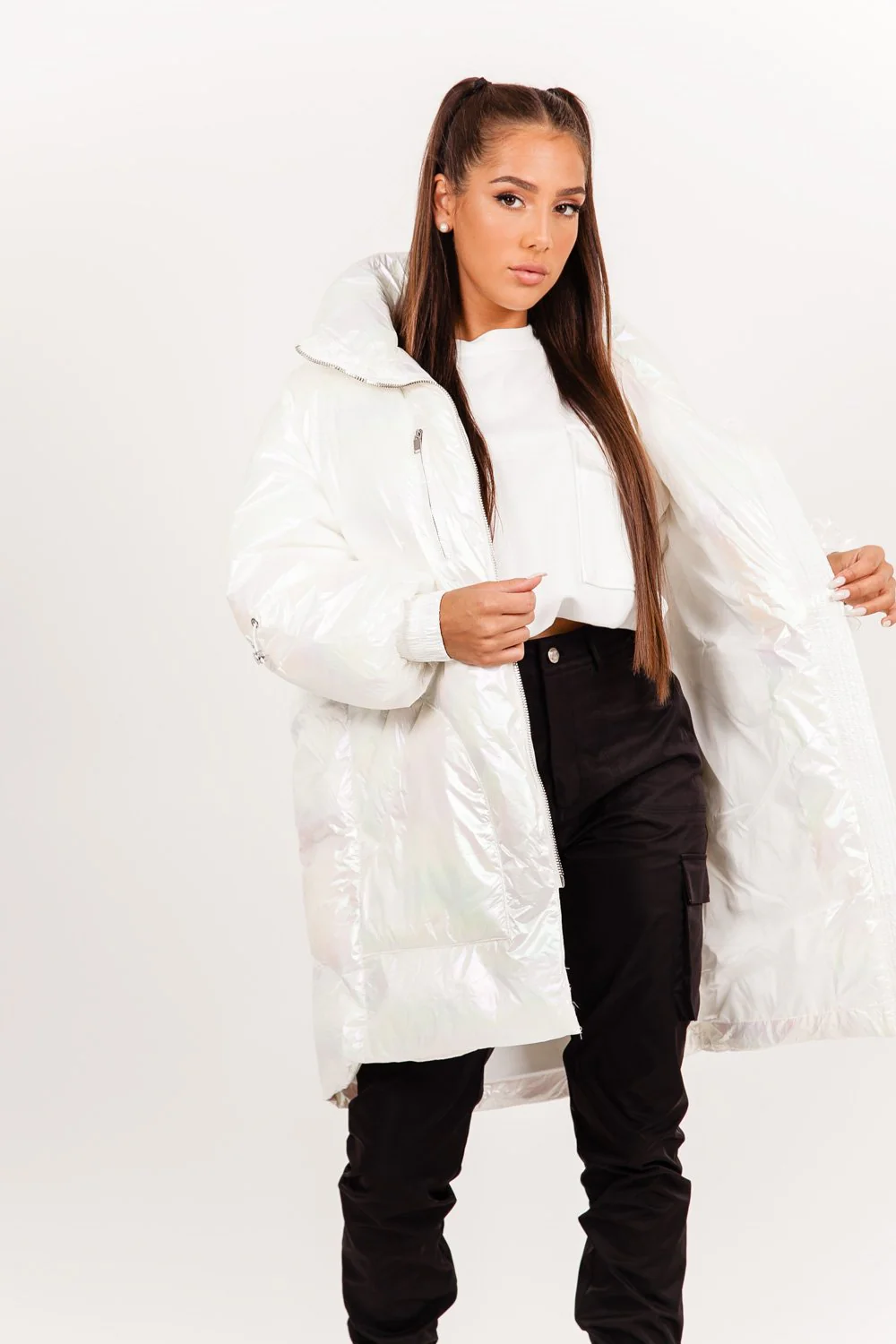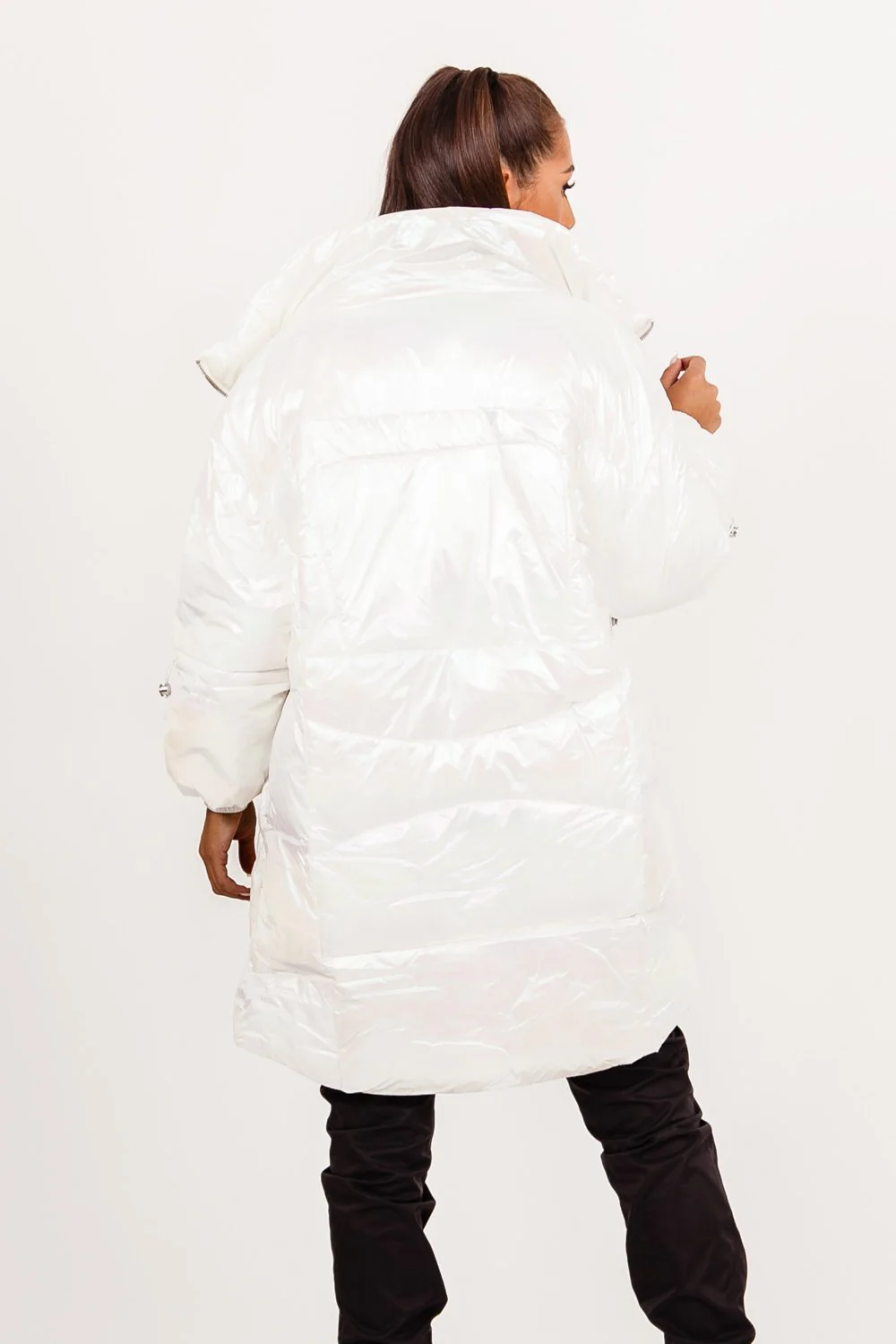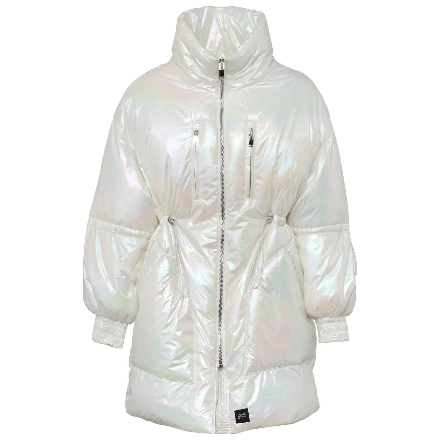 Doudoune pour femme de marque Sixth June. Effet rembourré et matelassé, aspect irisé et nacré avec des nuances de couleurs. Poches latérales, fausses poches avec zip sur la poitrine, fermeture centrale à zip. Cordons de serrage extérieur à la taille et au niveau des coudes, col rembourré et montant, élastiques aux poignets. Coupe large. Modèle blanc irisé.