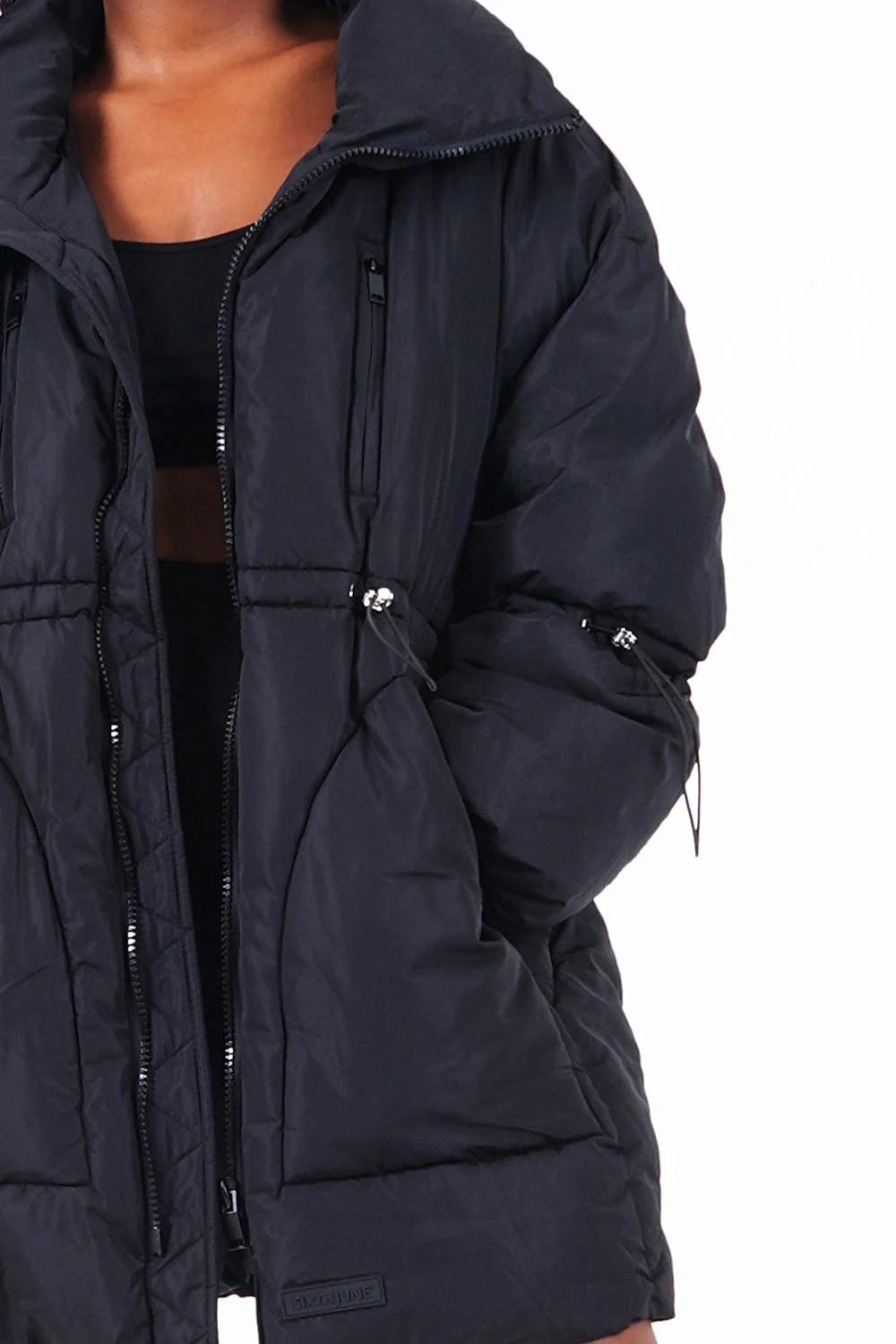 Effet matelassé, col montant et haut, élastique de serrage à la taille et au niveau des avant-bras, élastique aux poignets, fermeture centrale à zip. Deux poches latérales au niveau de la taille, deux poches latérales au niveau de la poitrine avec fermeture à zip, logo sur patch en caoutchouc à la base.
