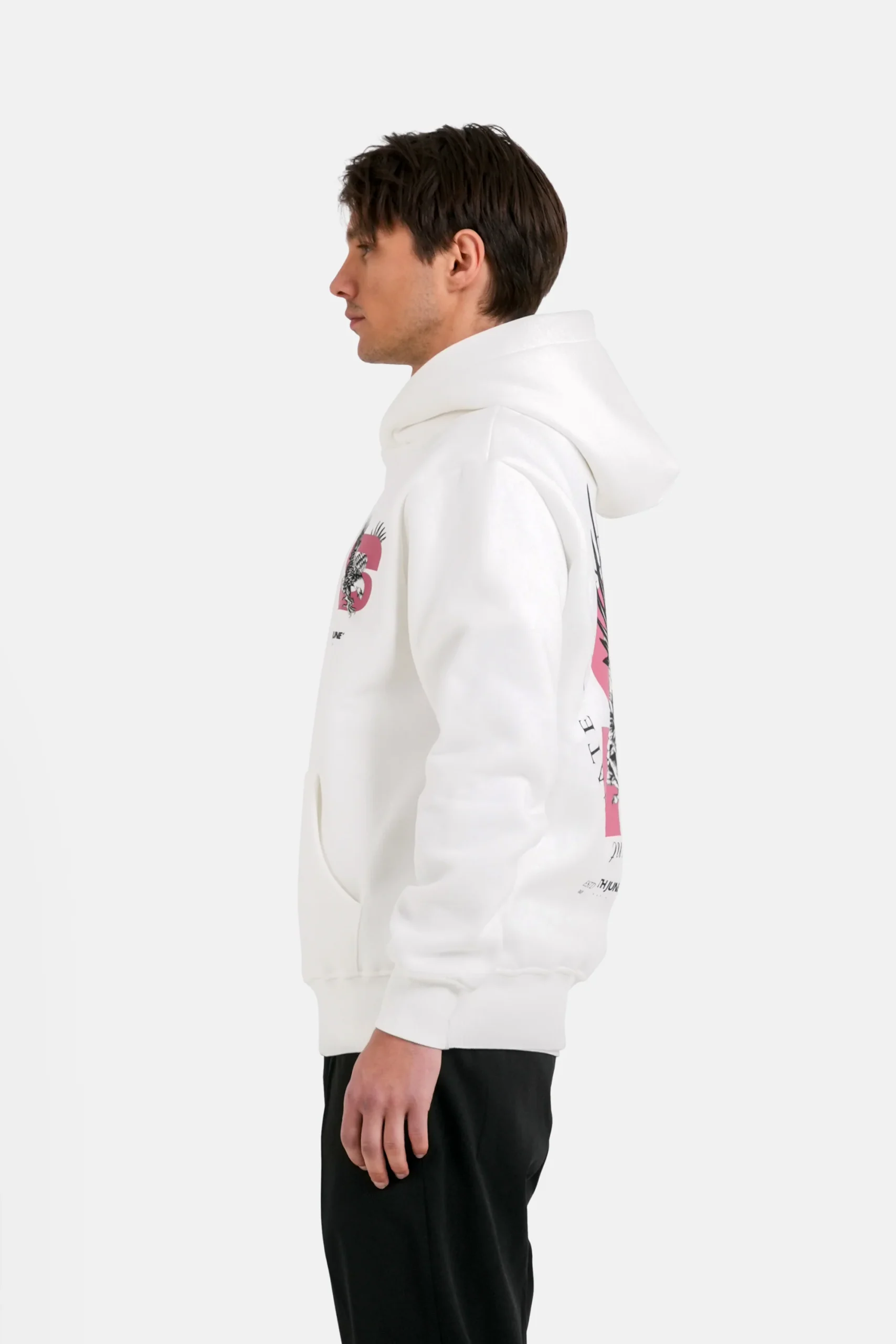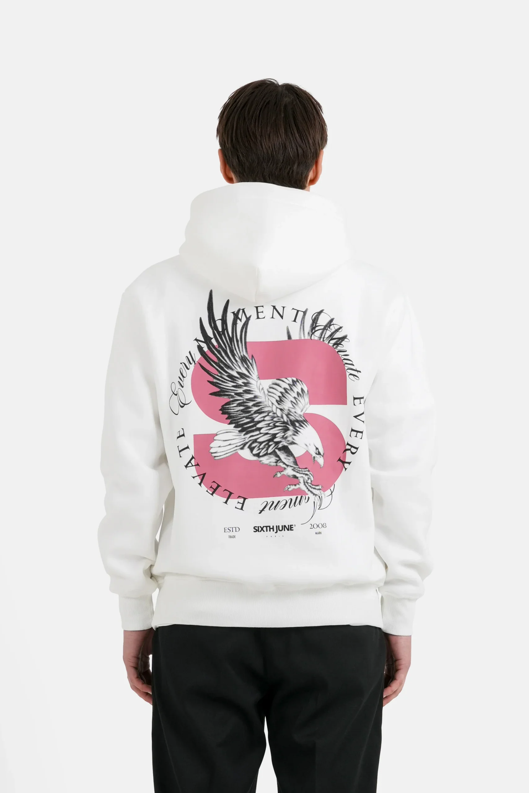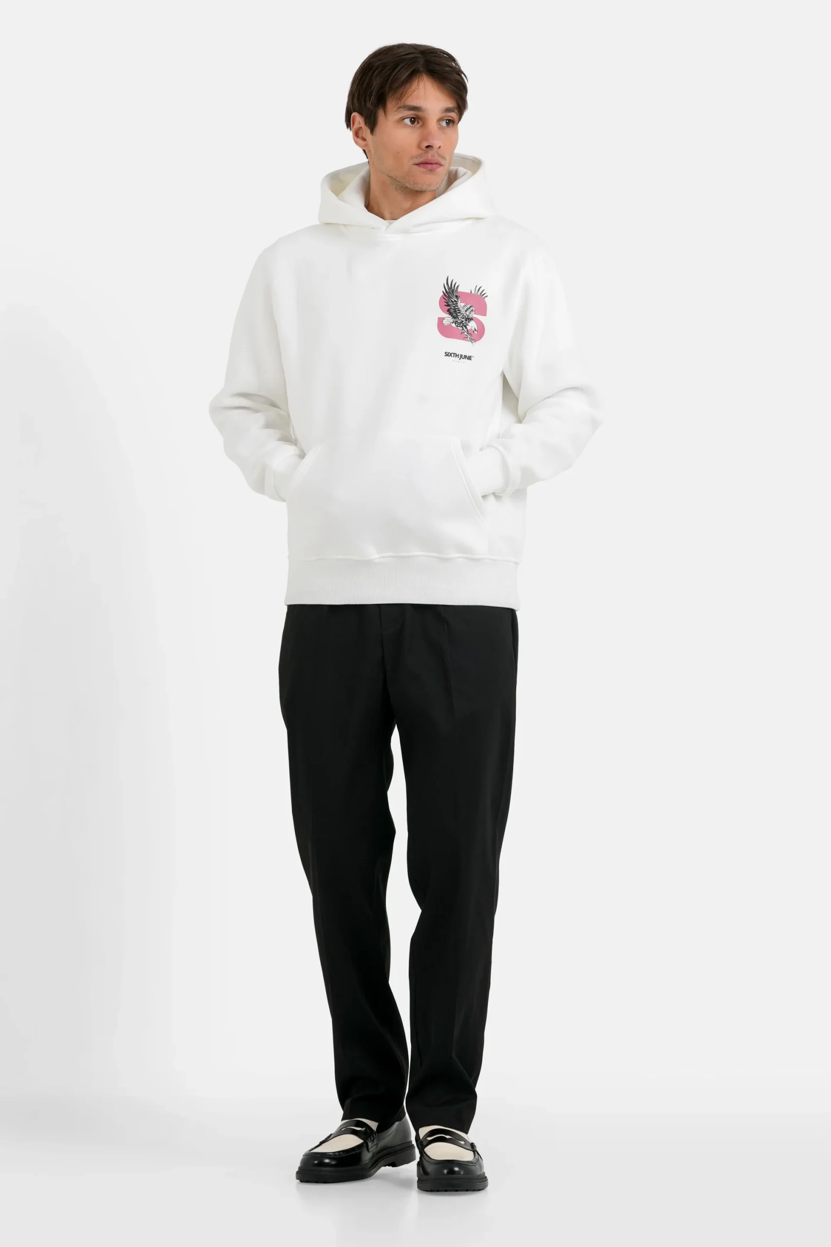 Sweatshirt pour homme de marque Sixth June. Motif à l’arrière avec aigle et textes. Print similaire à l’avant, en miniature, poche kangourou.