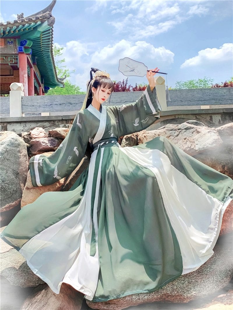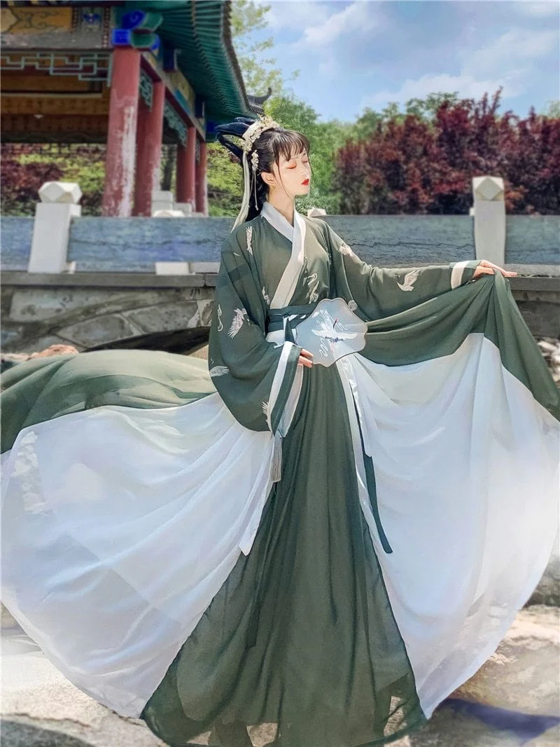 En plus, les motifs traditionnels comme la grue, qui ornent la tunique, apportent ce supplément d’âme qui différencie le Hanfu Vert et Blanc d’une simple robe. C’est un voyage dans l’histoire chinoise, en mode casual chic.