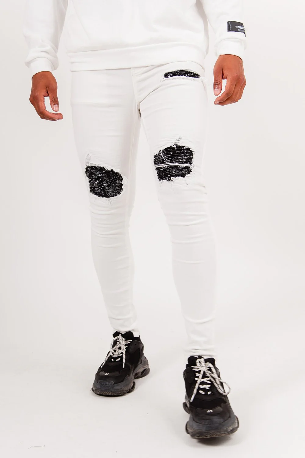 Jean pour homme de marque Sixth June. Effet déchiré aux genoux et sur la cuisse, doublure imprimé bandana. Poches à l’avant et l’arrière. Coupe slim. Modèle blanc. Composition: coton (98%) – spandex (2%). Imprimé: non. Motif: uni. Taille: aucune. Hauteur: taille standard. Coupe: skinny.
