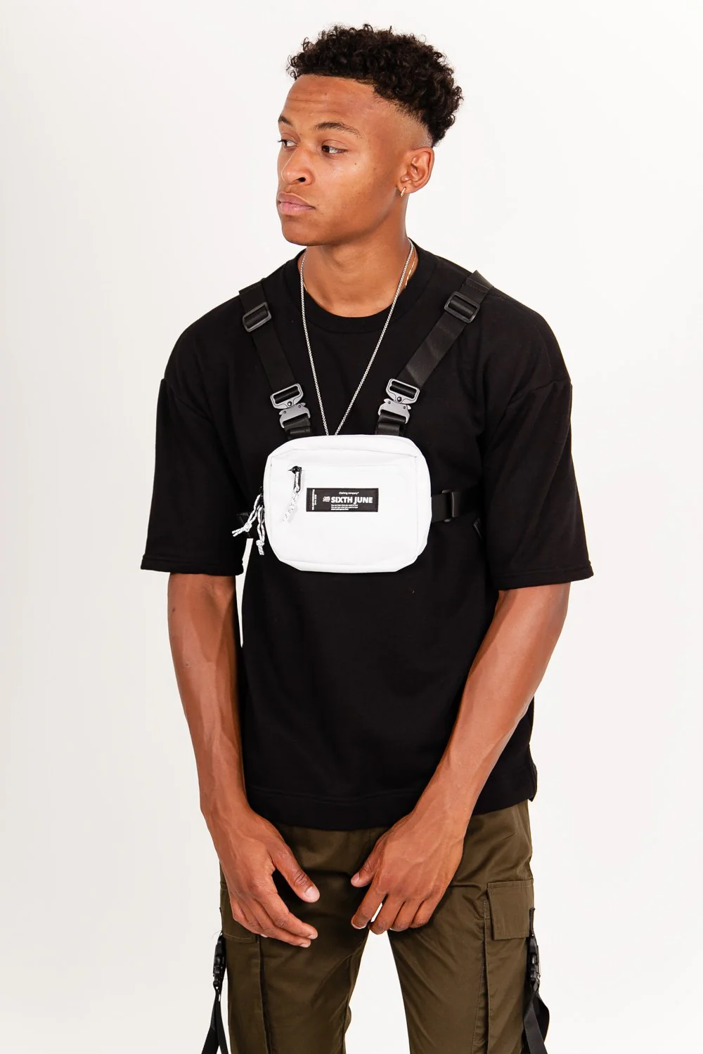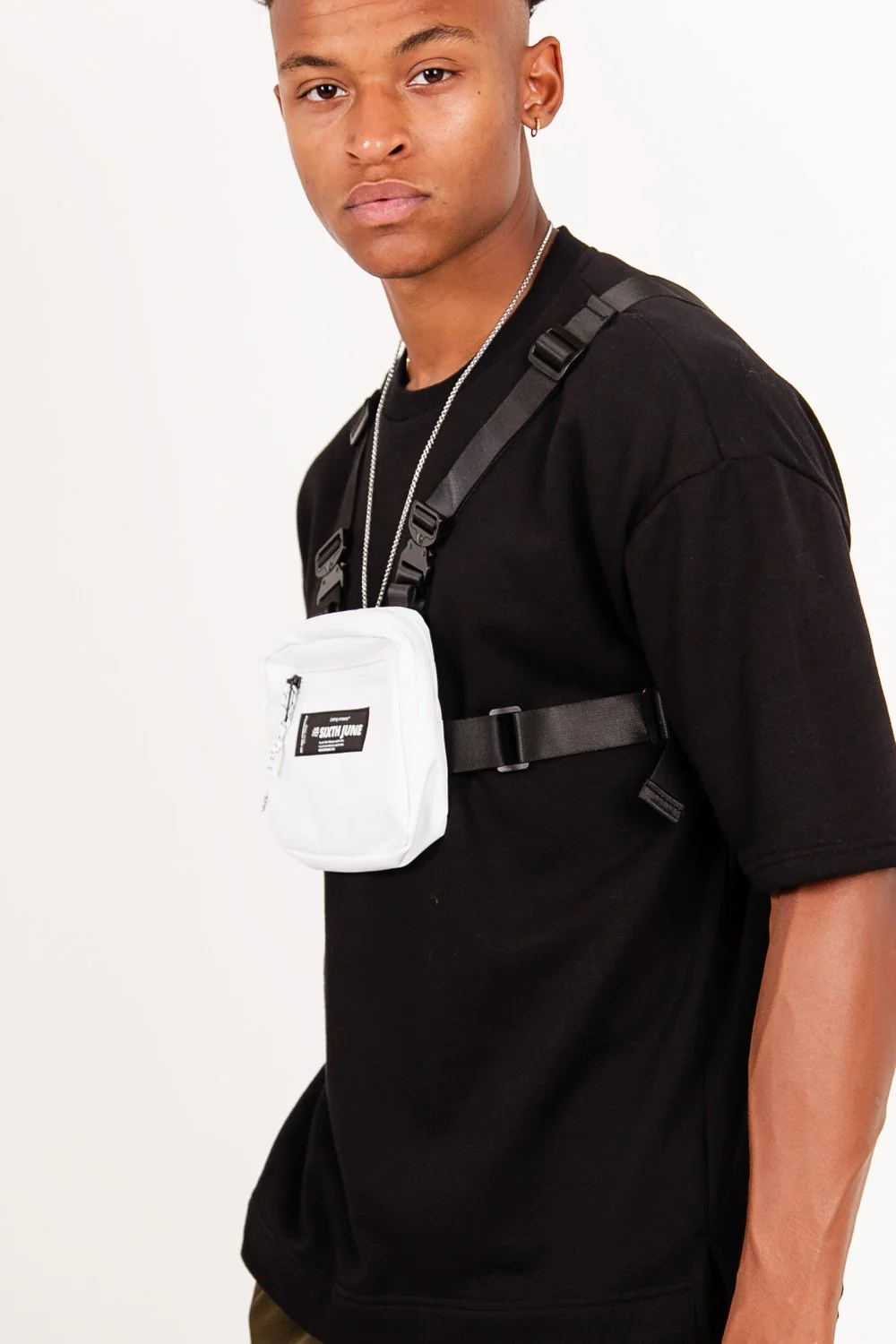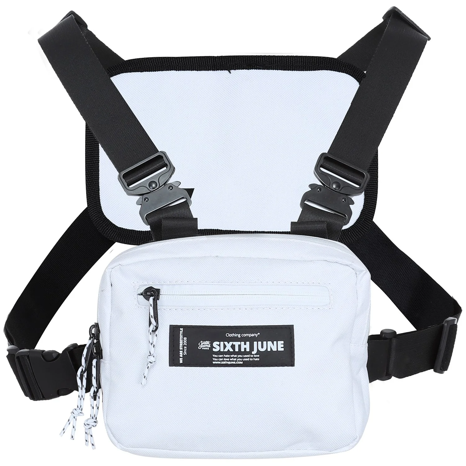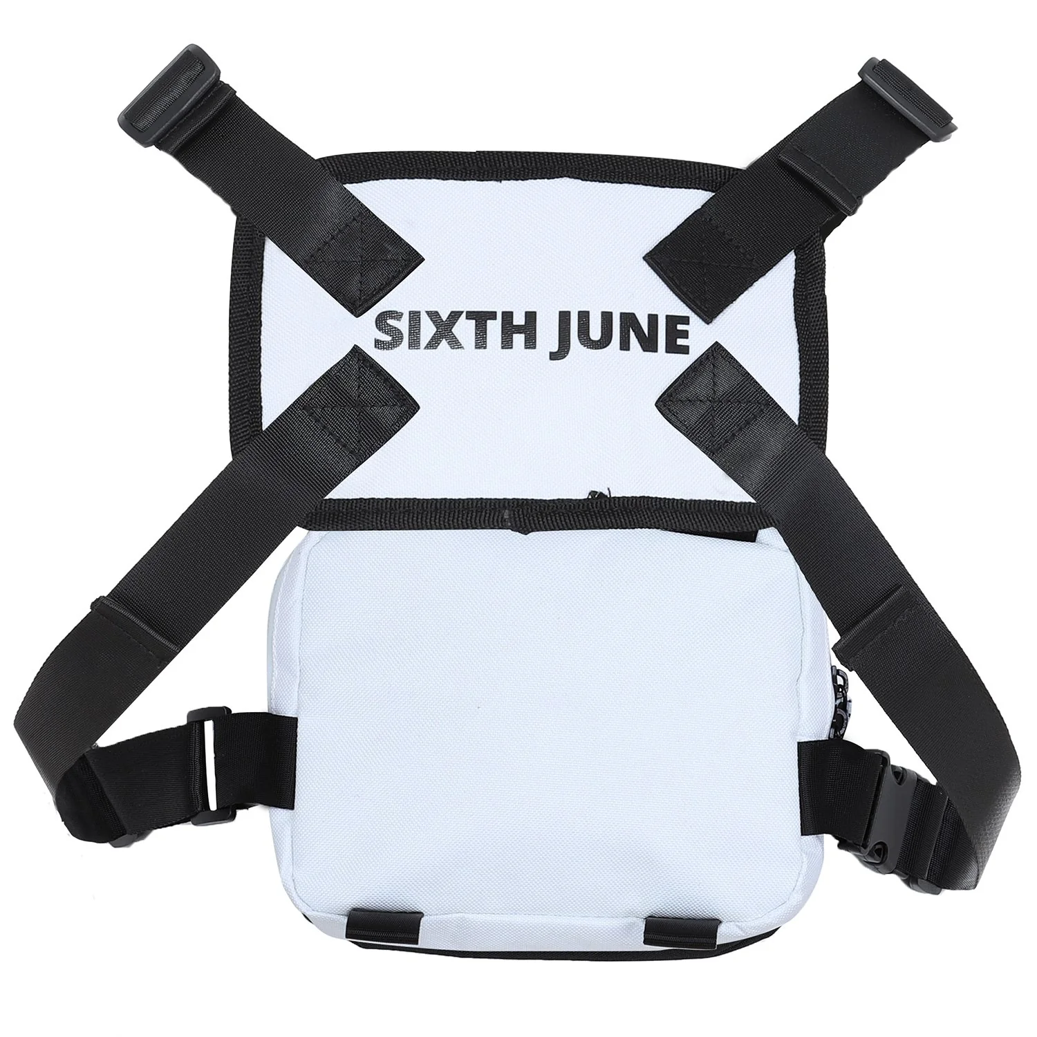 poitrine mini format pour homme et femme de marque Sixth June. Dimensions: 18x14x1,5(cm), boucles sur les côtés et en métal au niveau des épaules. Bretelles ajustables, poches sur le dessus et sur l’avant avec fermetures zippées, logo Sixth June brodé à l’avant. Modèle blanc.