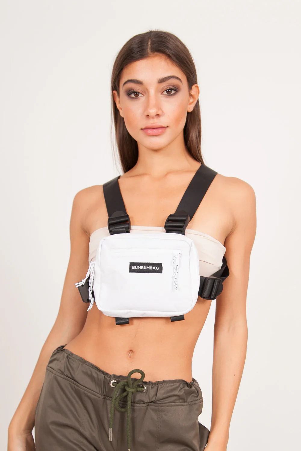 Mini sac poitrine Bumbumbag très petit format pour homme et femme. Dimensions: 18*14*1.5(cm), logo brodé à l’avant. Bretelles ajustables, fermoirs sécurisés, zip à l’avant, poche avant et poche intérieure. Modèle blanc.