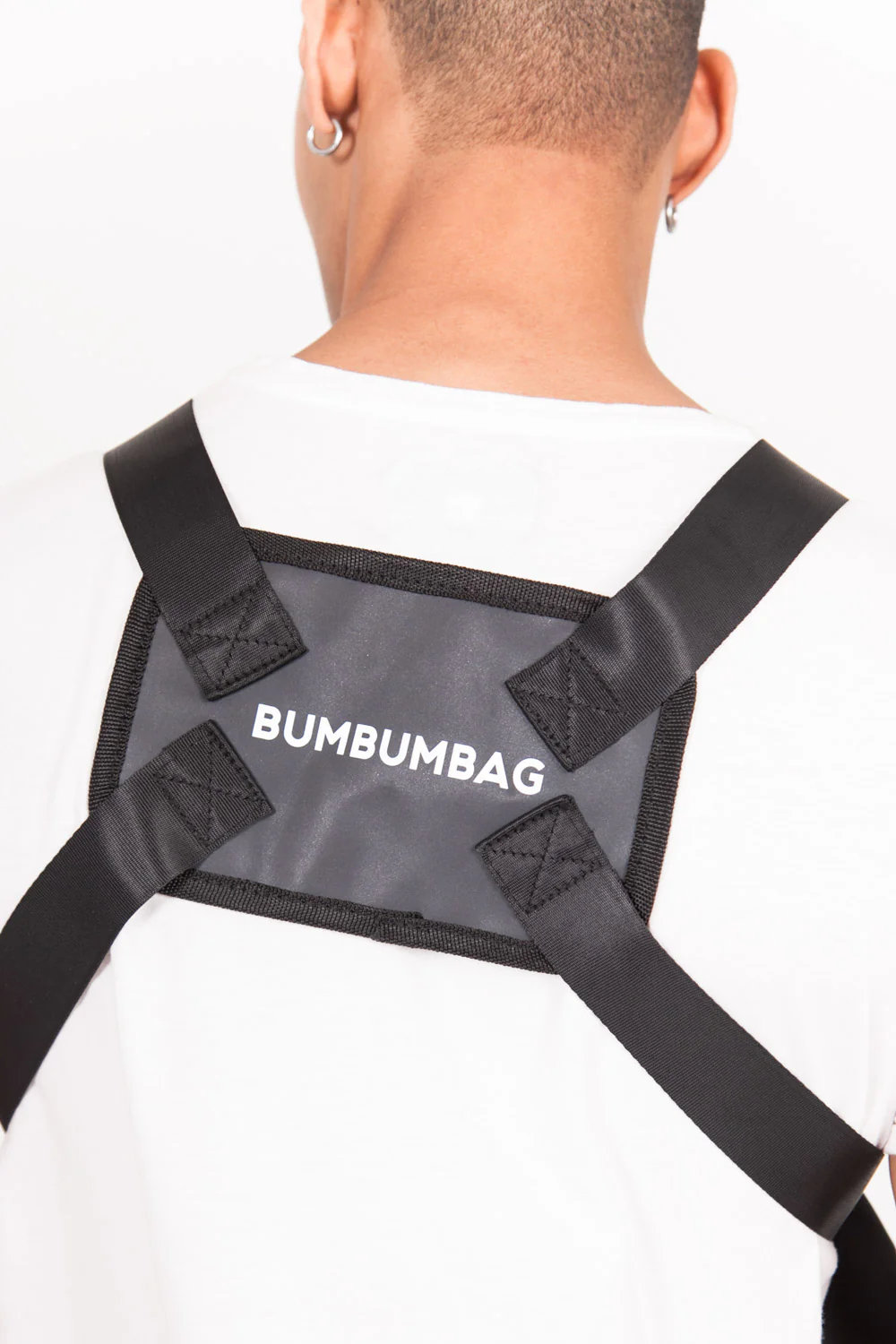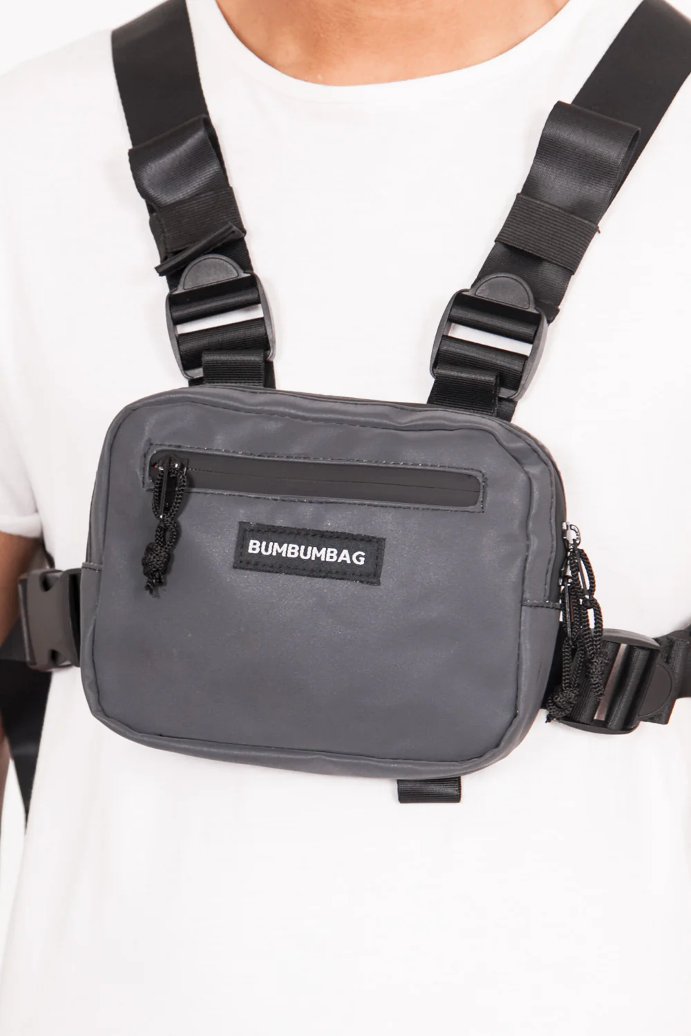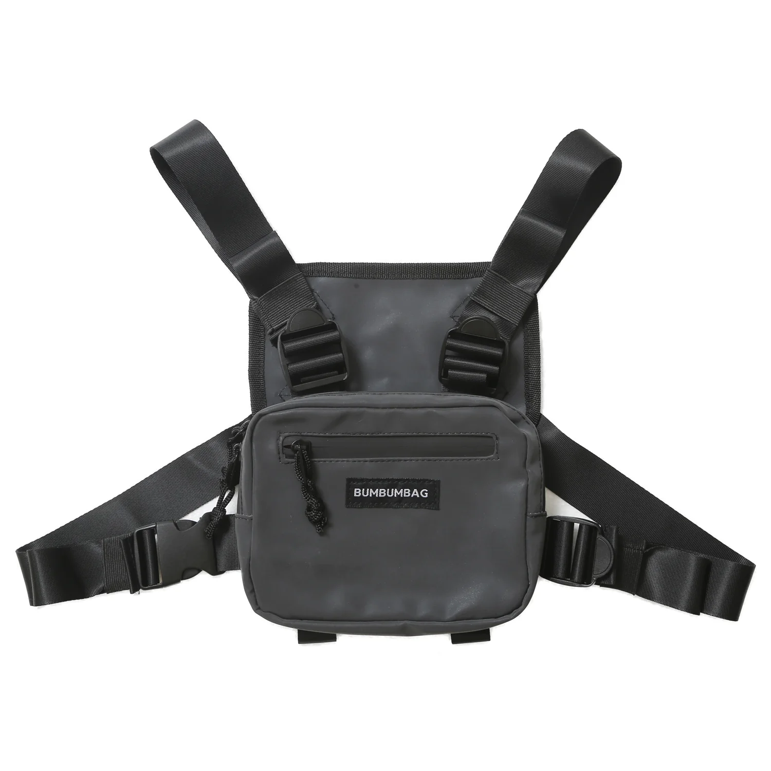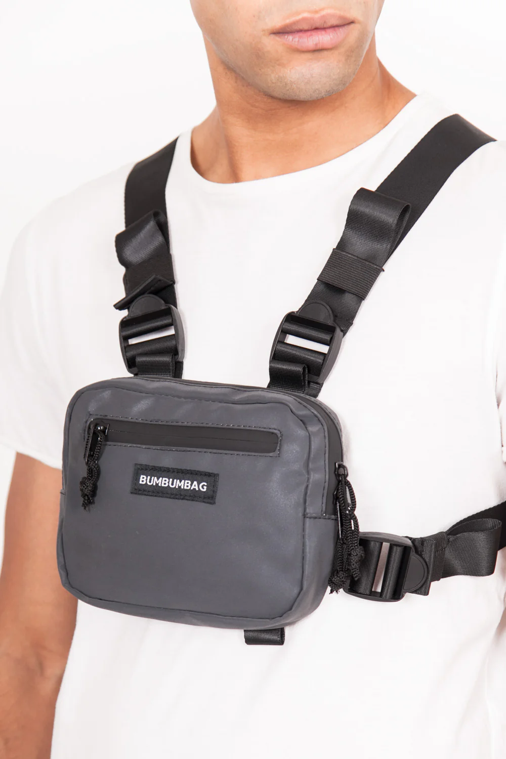 Mini sac poitrine Bumbumbag très petit format pour homme et femme. Dimensions: 18*14*1.5(cm), matière entièrement réfléchissante, effet brillant à la lumière. Logo brodé à l’avant. Bretelles ajustables, fermoirs sécurisés, zip à l’avant, poche avant et poche intérieure. Modèle noir.