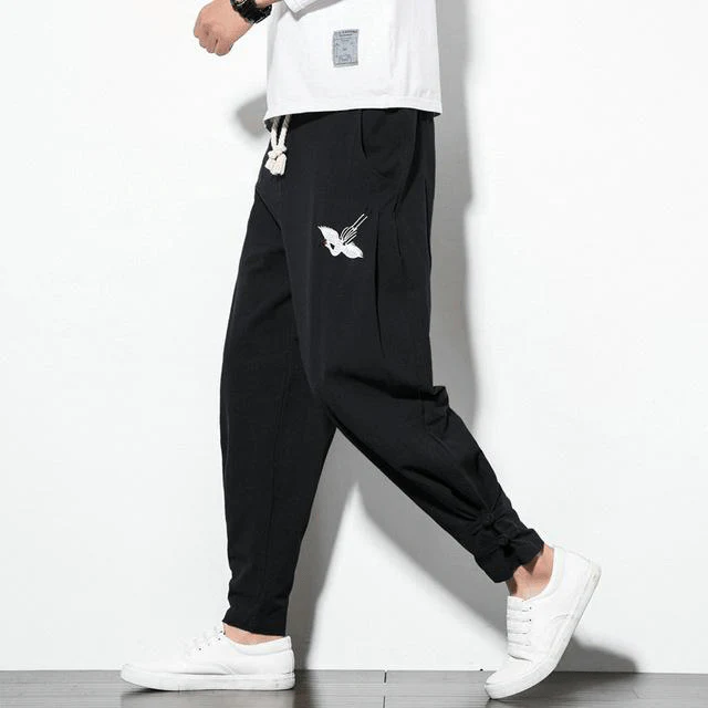La broderie de la grue est un vrai point de conversation, et ce pantalon saura séduire autant vos collègues que vos amis.