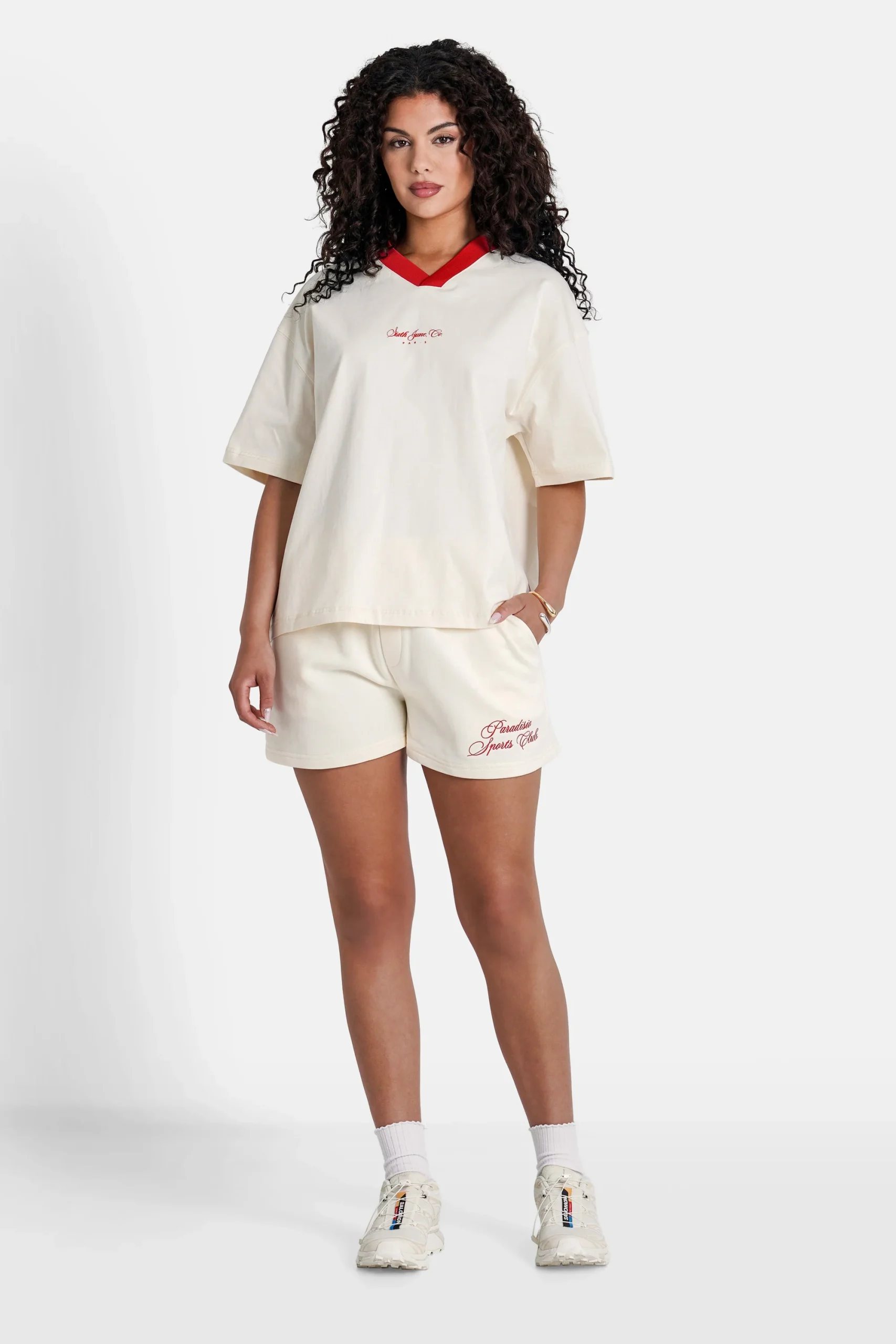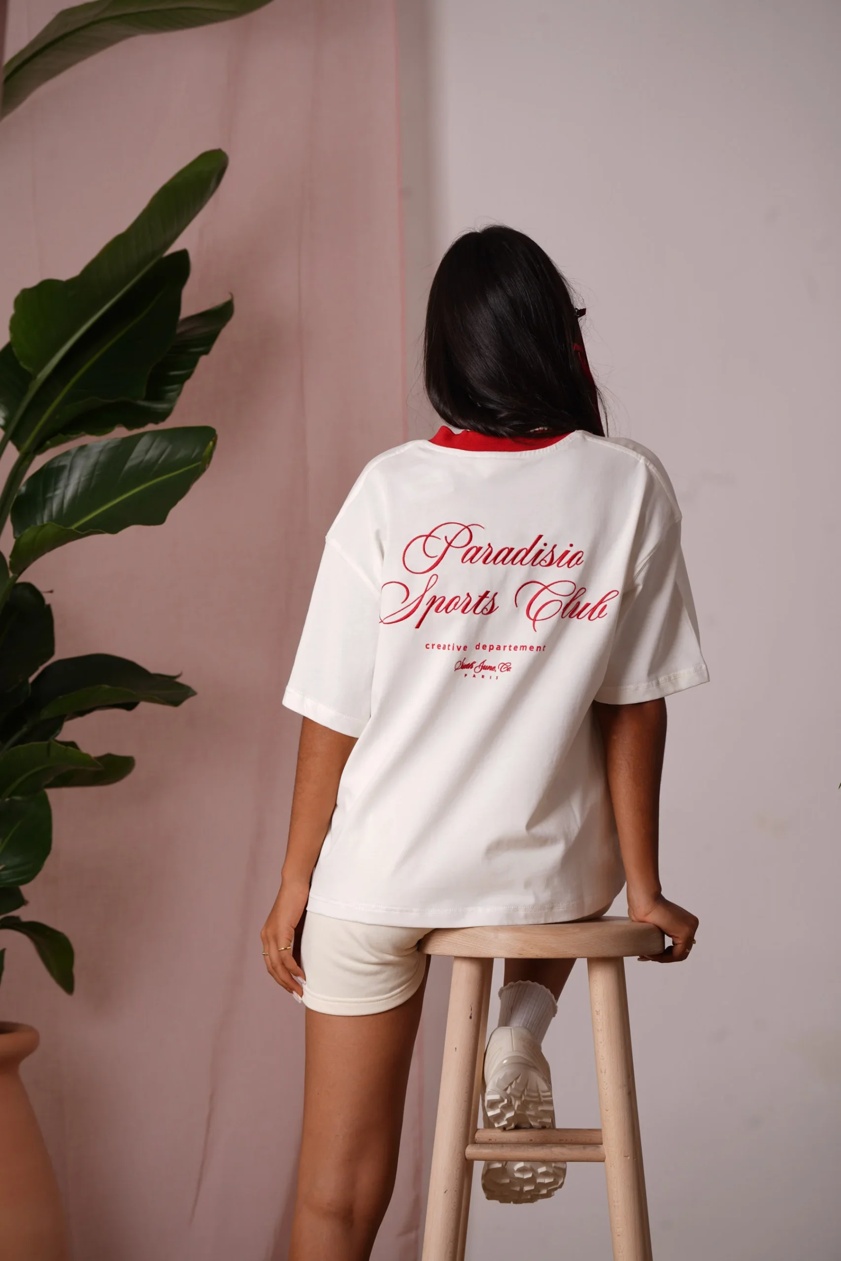 T-shirt pour femme de marque Sixth June. Broderie rouge à l’arrière. Col en V, matière élastique et côtelée, effet sport.