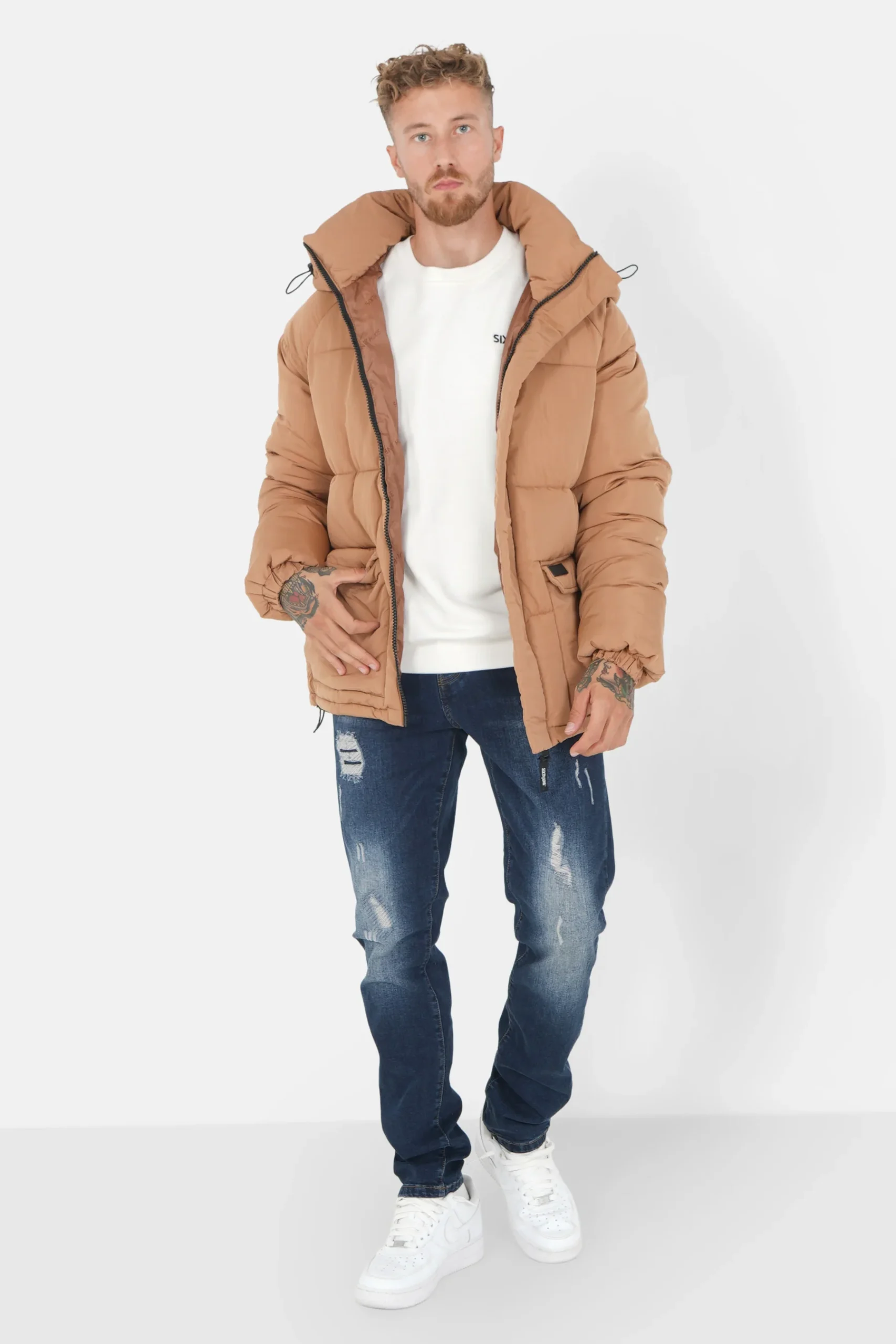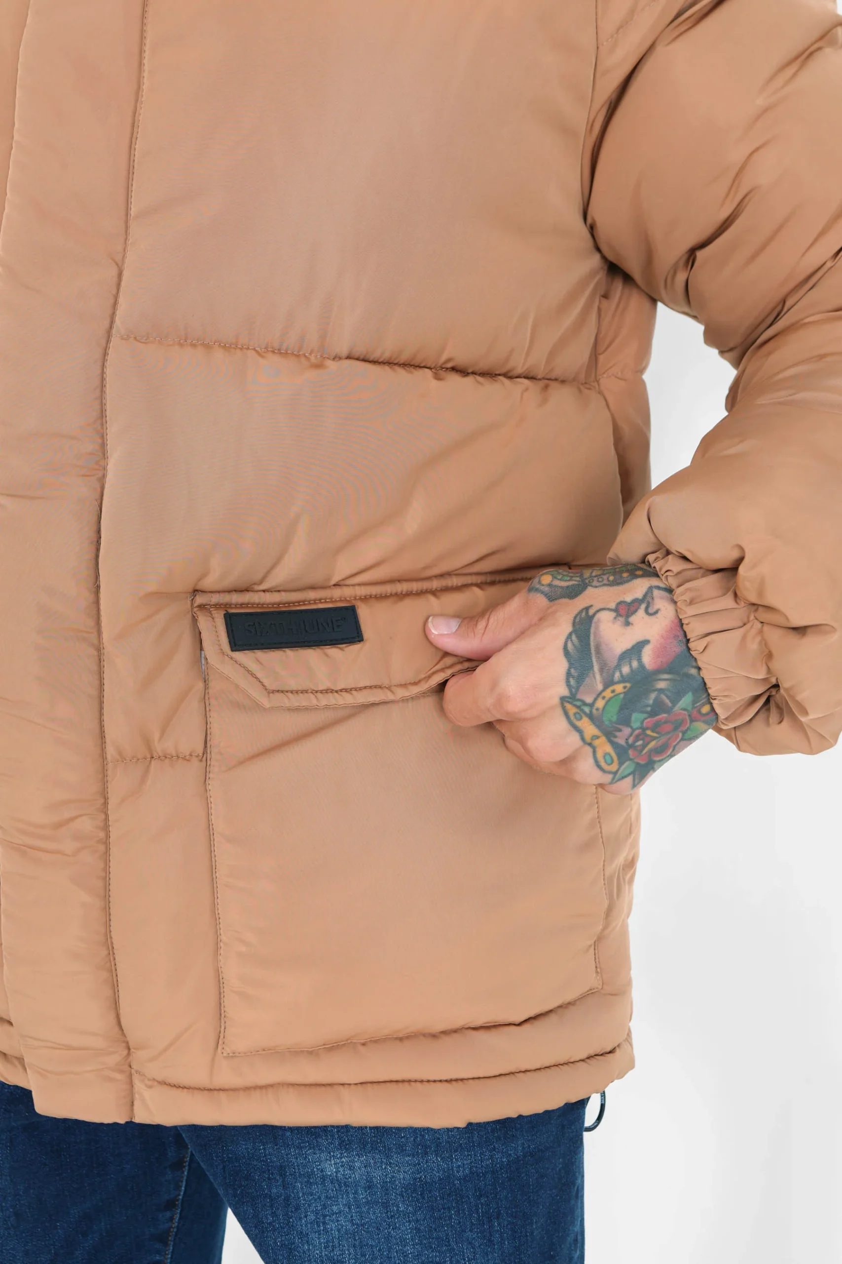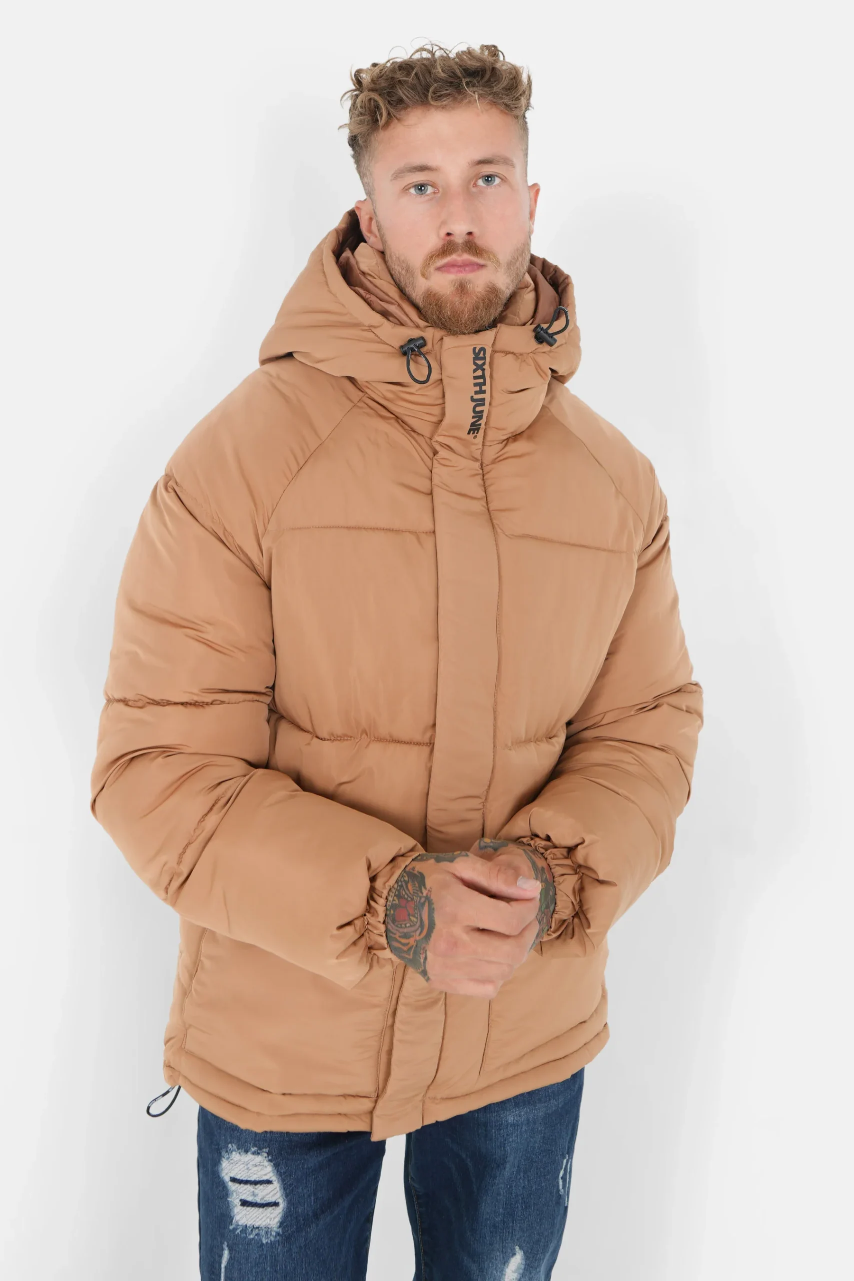 Effet matelassé, col montant avec capuche à cordon de serrage, logo imprimé sur la languette au niveau du col, deux poches avant à rabat et fermeture à aimant, poche intérieur.