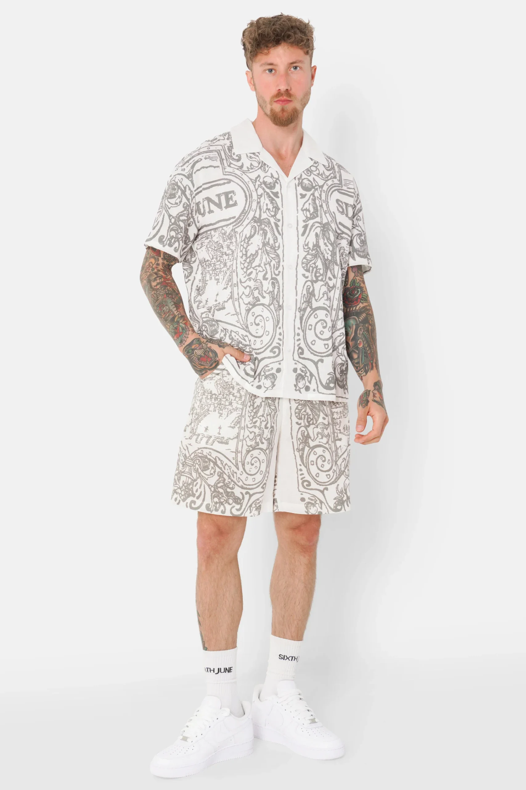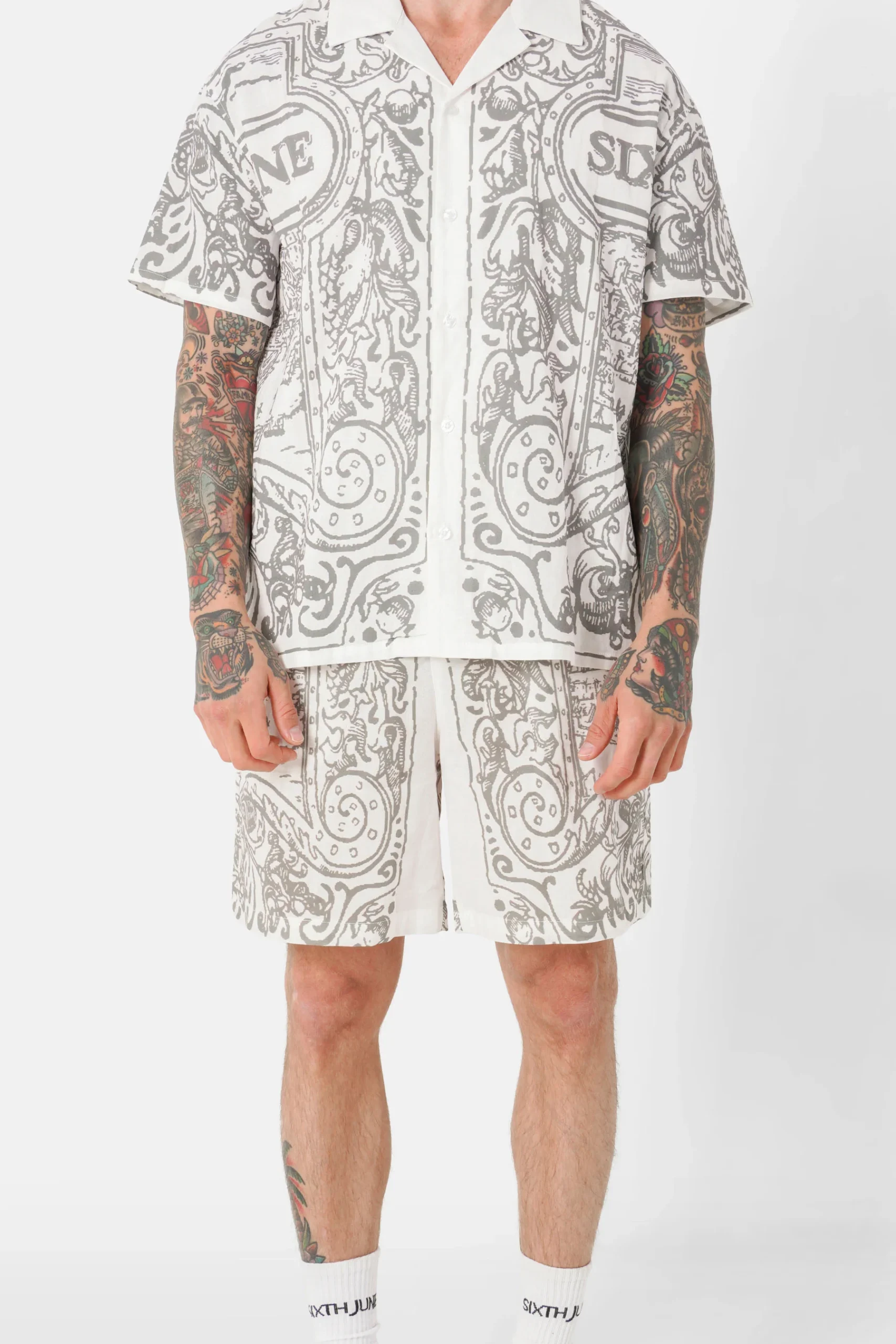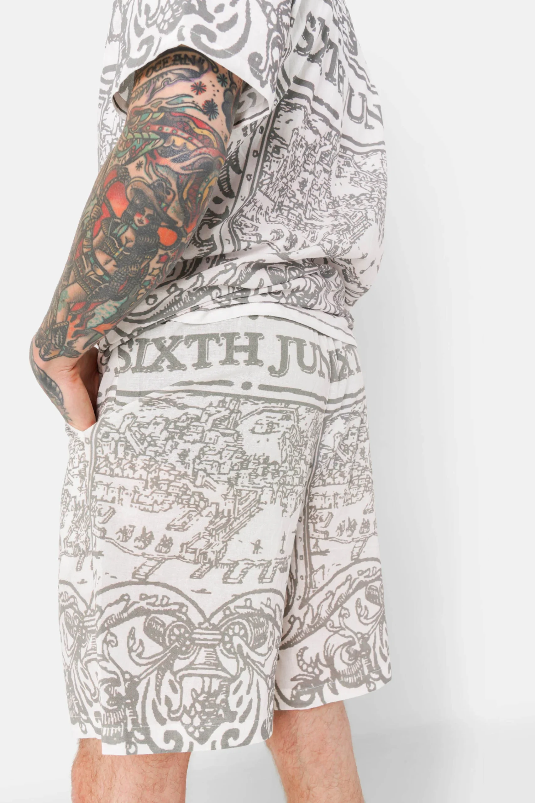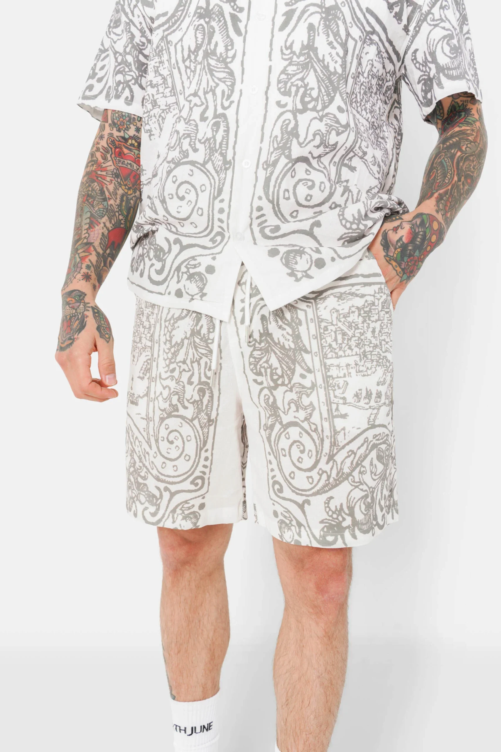Short pour homme de marque Sixth June. Imprimé azulejos sur l’ensemble du tissu. Taille élastique avec cordon de serrage, poches latérales. Composition: lin (50%) – coton (50%). Imprimé: oui. Motif: graphique. Taille: élastiquée. Hauteur: taille standard.