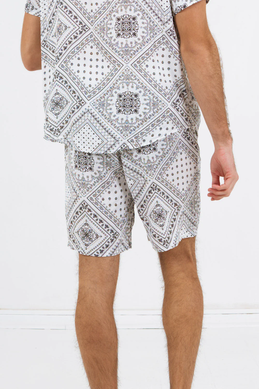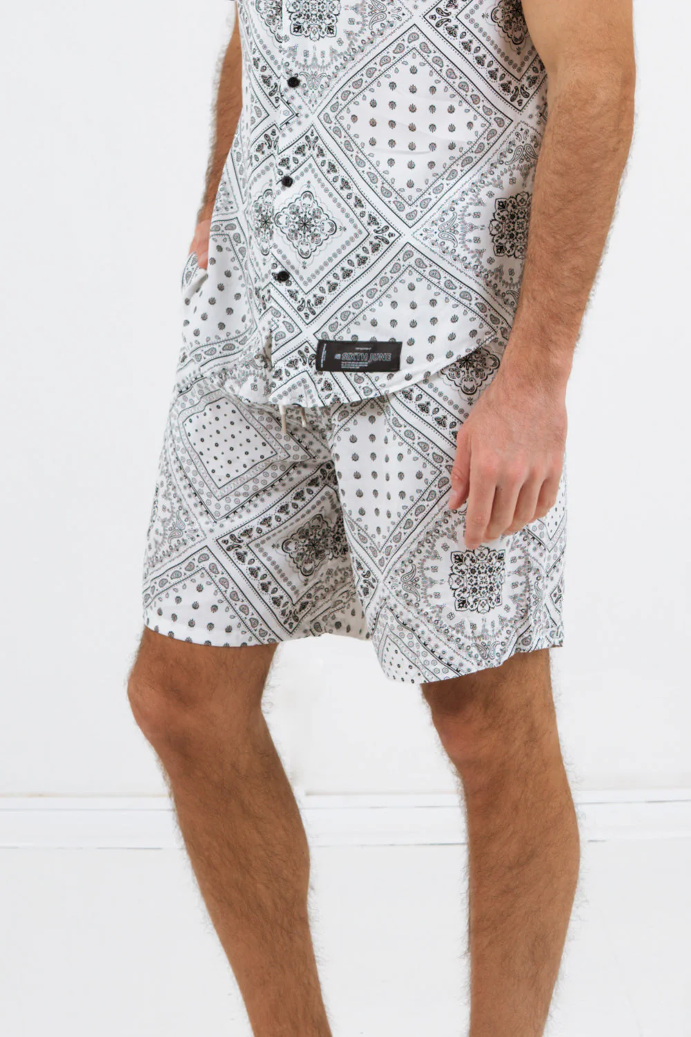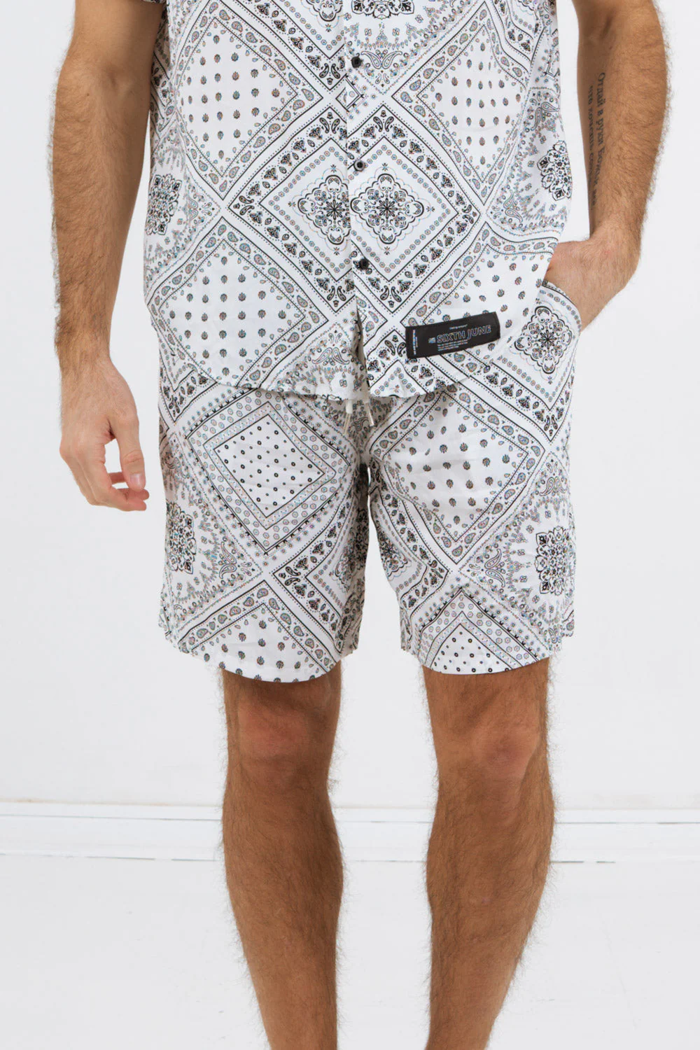Short pour homme de marque Sixth June. Imprimé bandana sur l’ensemble du tissu. Taille élastique avec cordon de serrage, poches avant latérales, fausse poche à l’arrière. Coupe confort, fluide. Composition: viscose (100%). Imprimé: oui.