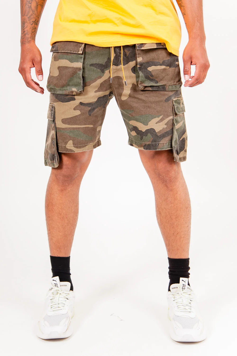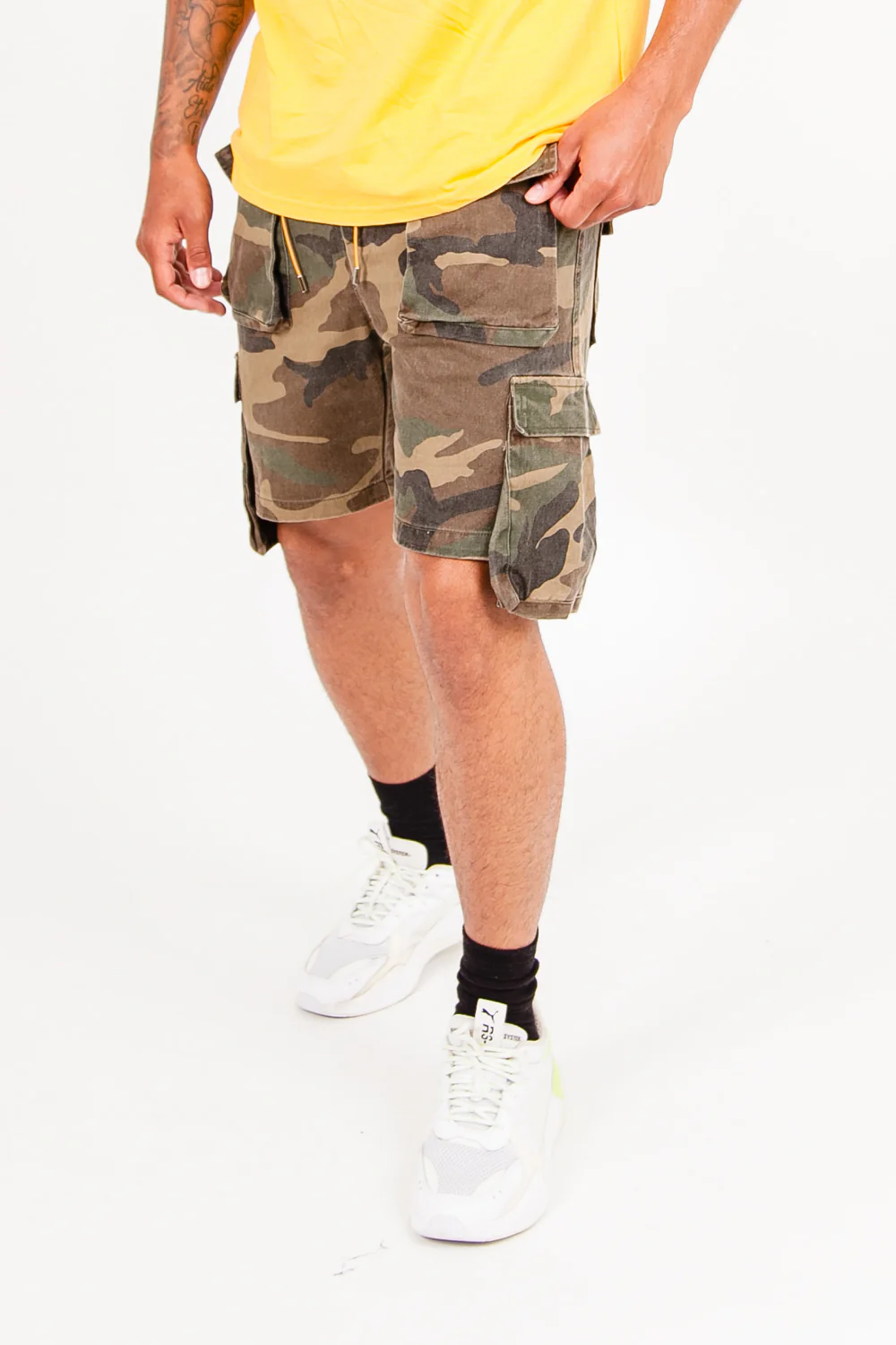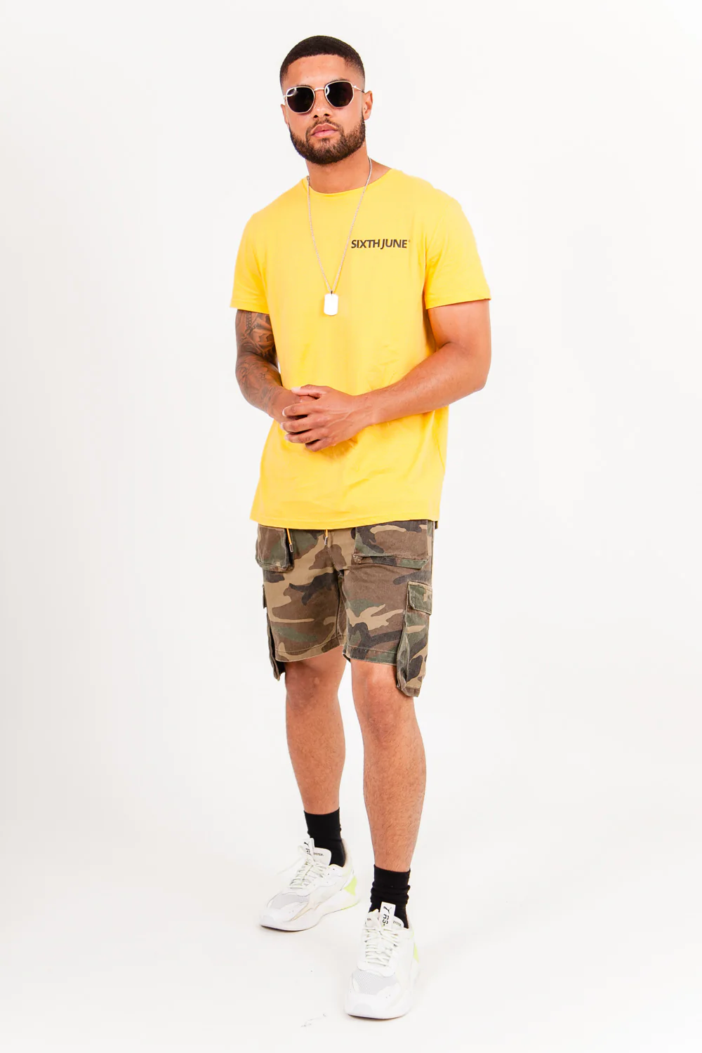 Short pour homme de marque Sixth June. Deux poches cargo sur l’avant et l’arrière. Poches sur les côtés, plus longues que le short. Cordons de serrage à la taille, imprimé militaire. Coupe classique. Modèle kaki.