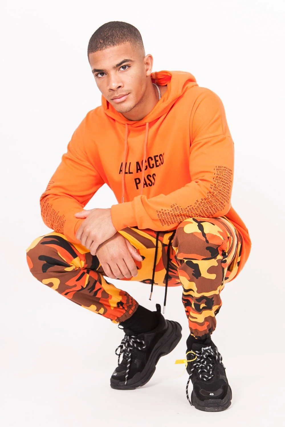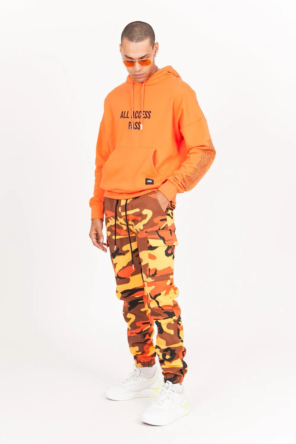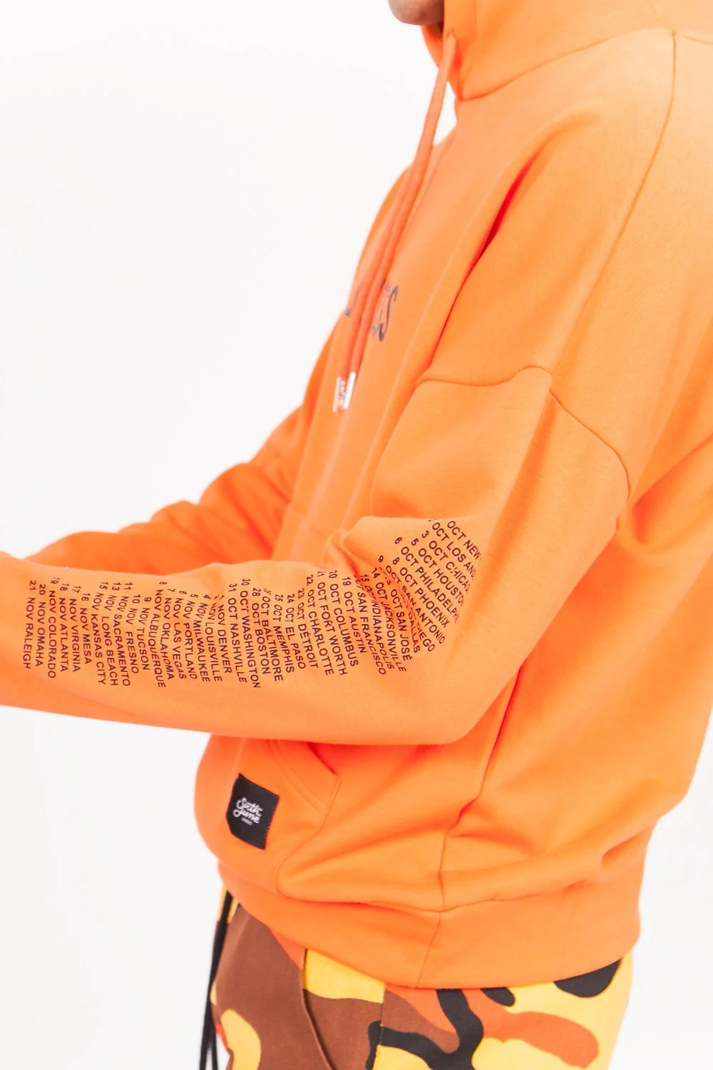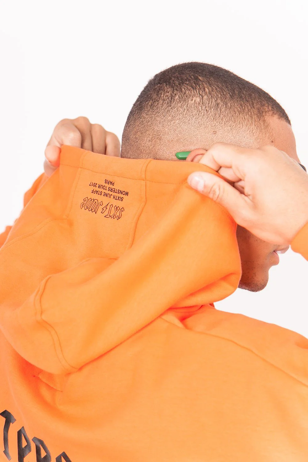 Sweat à capuche homme Sixth June avec imprimés « All Access Pass » à l’avant et « Monsters Tour Merchandise » au dos. Coupe large, poche kangourou, capuche avec cordons de serrage, inscriptions sur les manches et la capuche. Modèle orange.