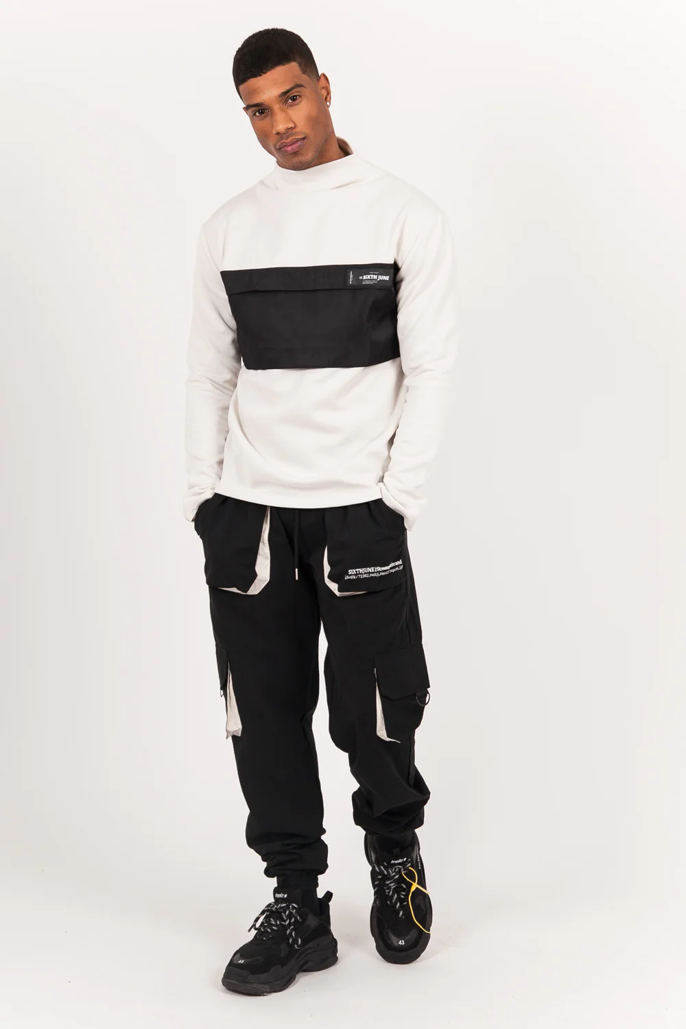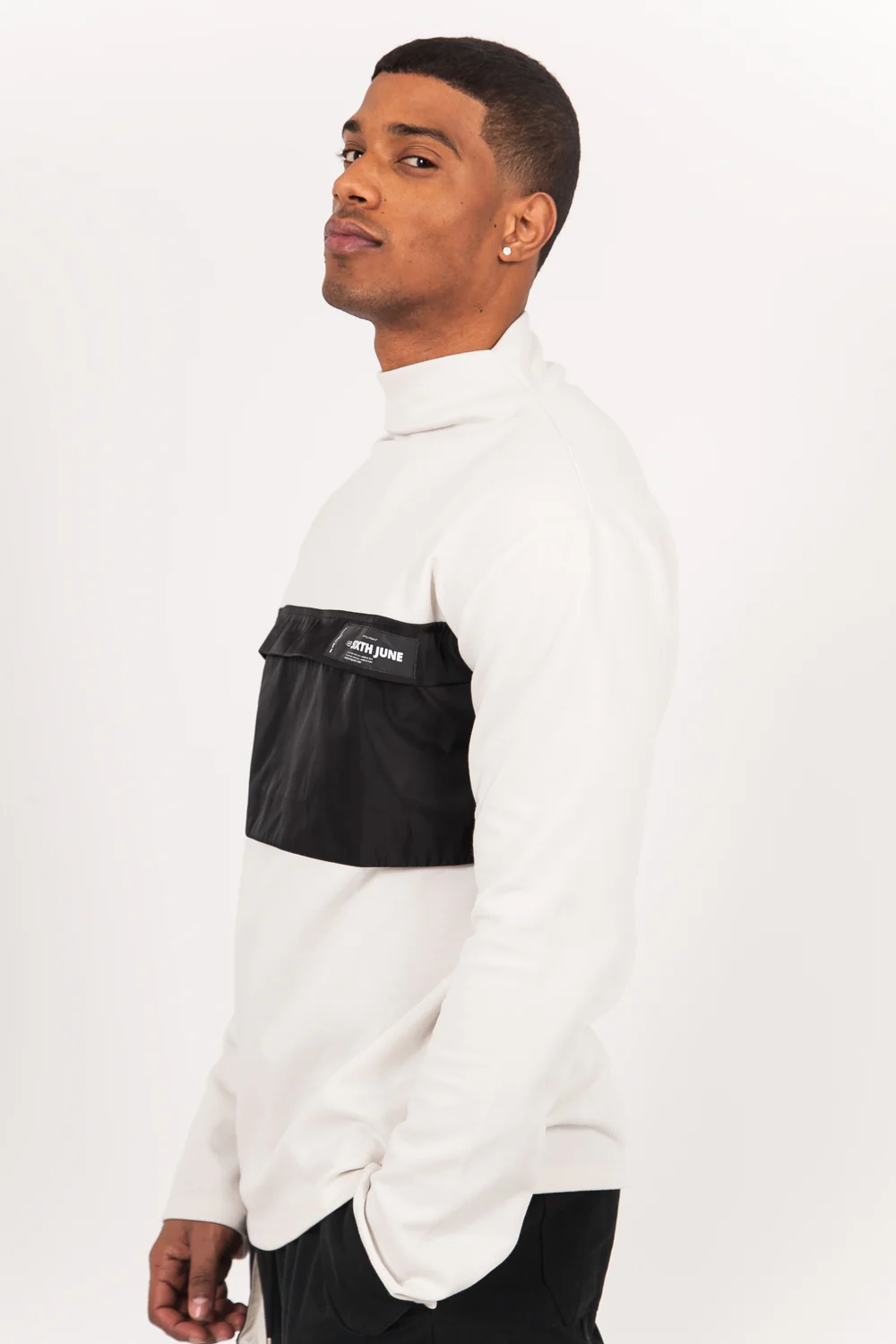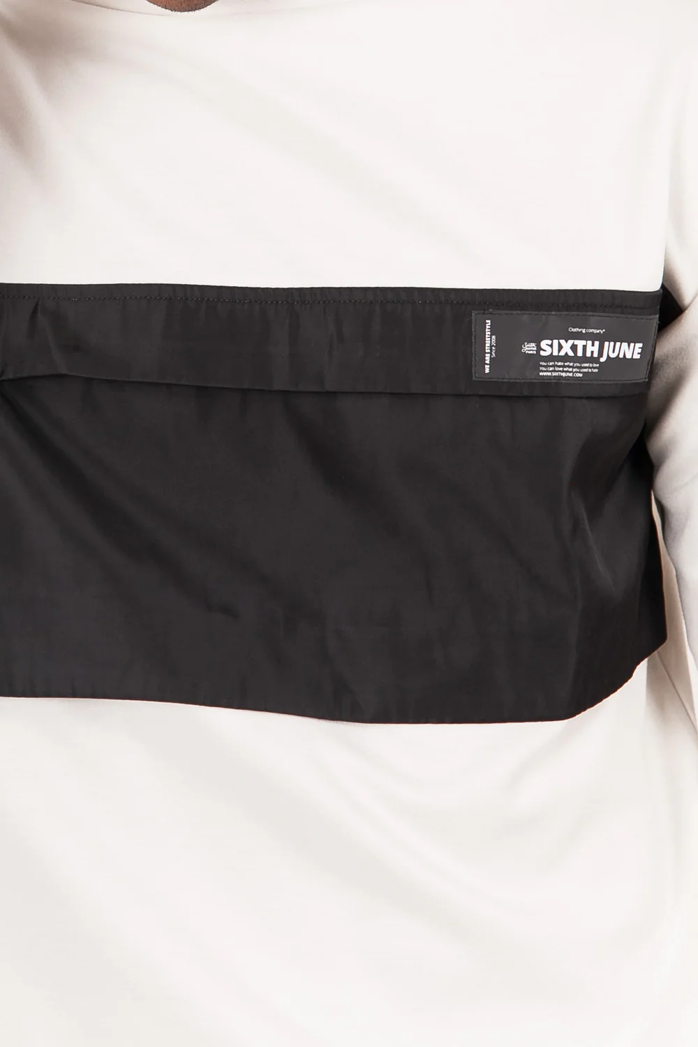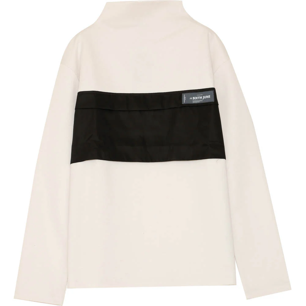 Sweat manches longues pour homme de marque Sixth June. Col montant élastique. Poche centrale en matière synthétique avec fermeture zippée, patch réfléchissant. Coupe classique. Modèle écru et noir.