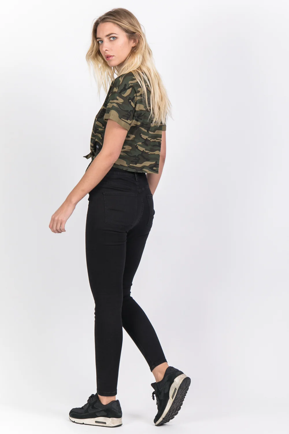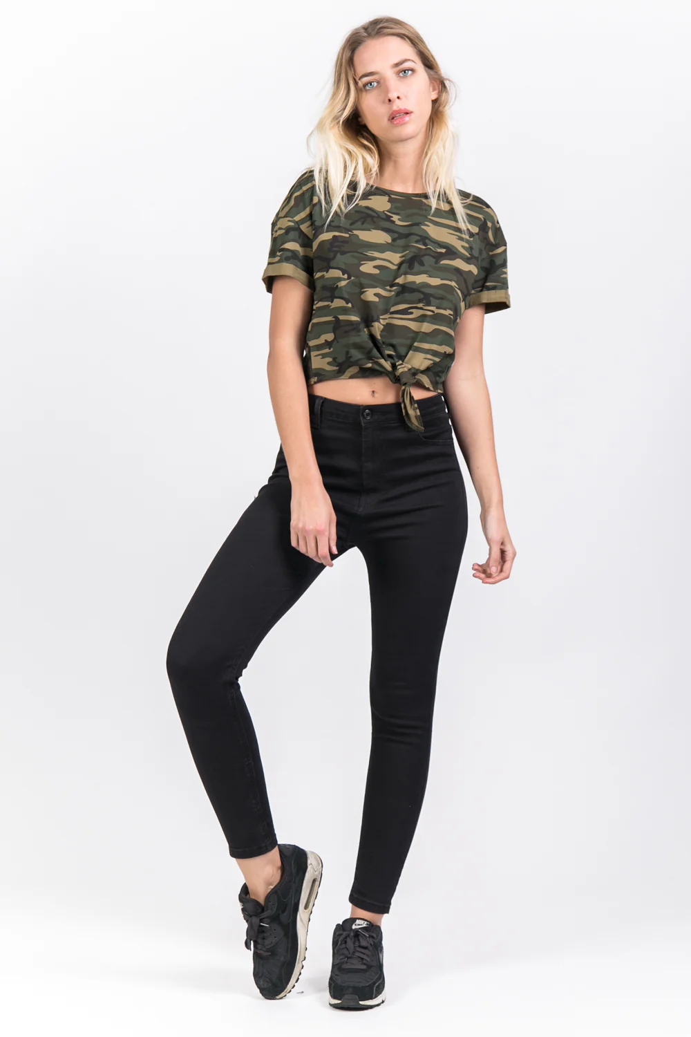 T-shirt femme Sixth June avec un motif camouflage et noeud sur le bas. Coupe courte, manches courtes et ourlet au niveau des manches. Modèle kaki