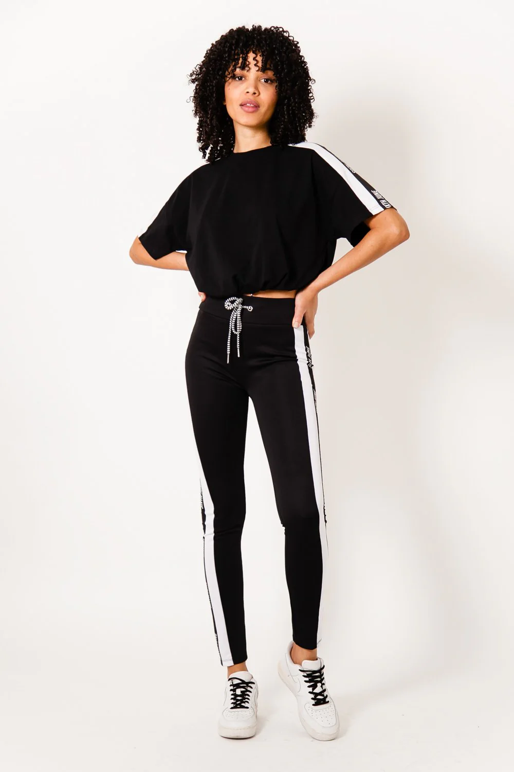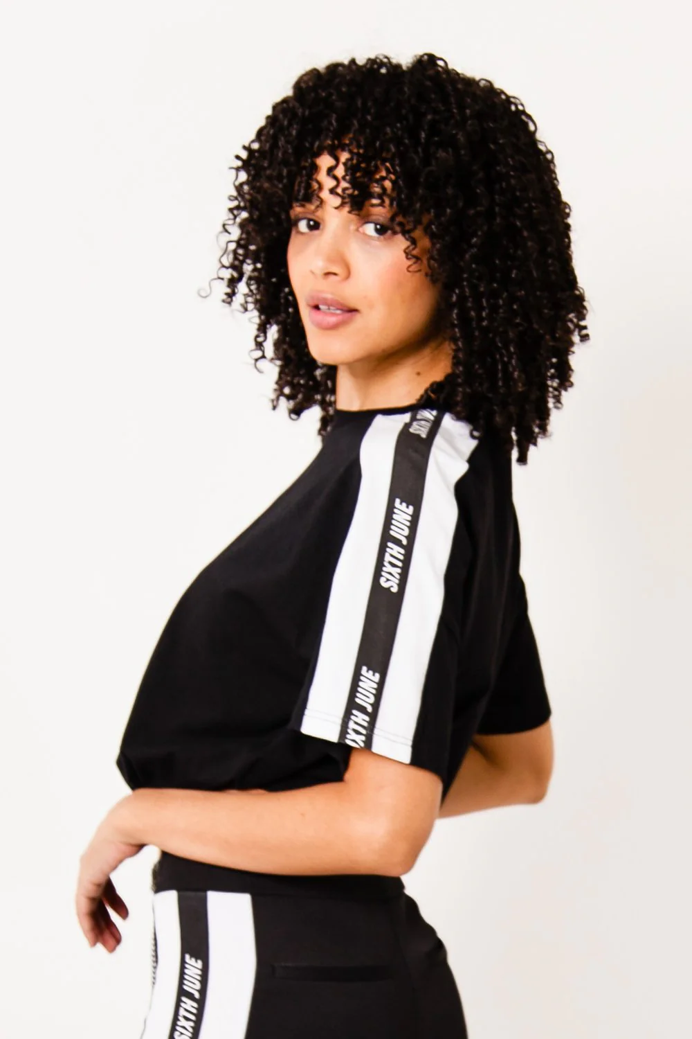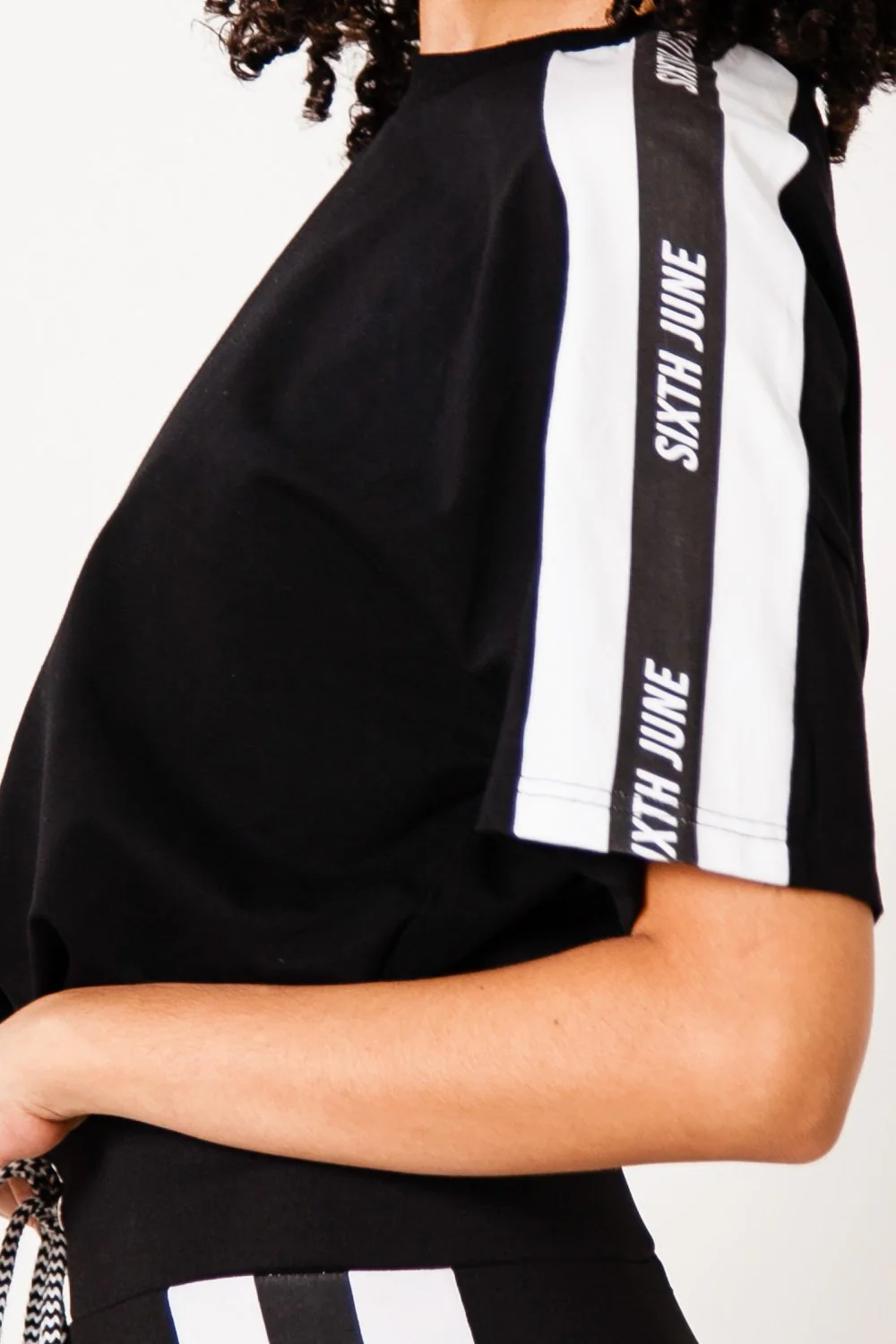 T-Shirt à manches courtes pour femme de marque Sixth June. Bandes le long des manches avec logo. Cordons de serrage, col rond. Coupe ample, épaules tombantes et courte. Modèle noir.