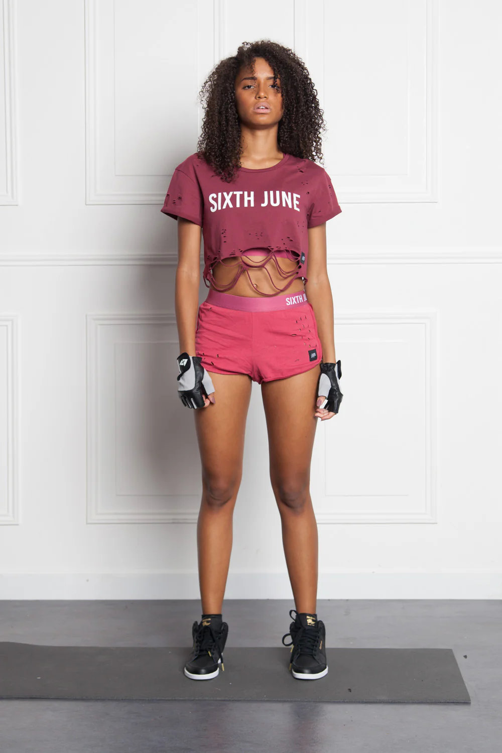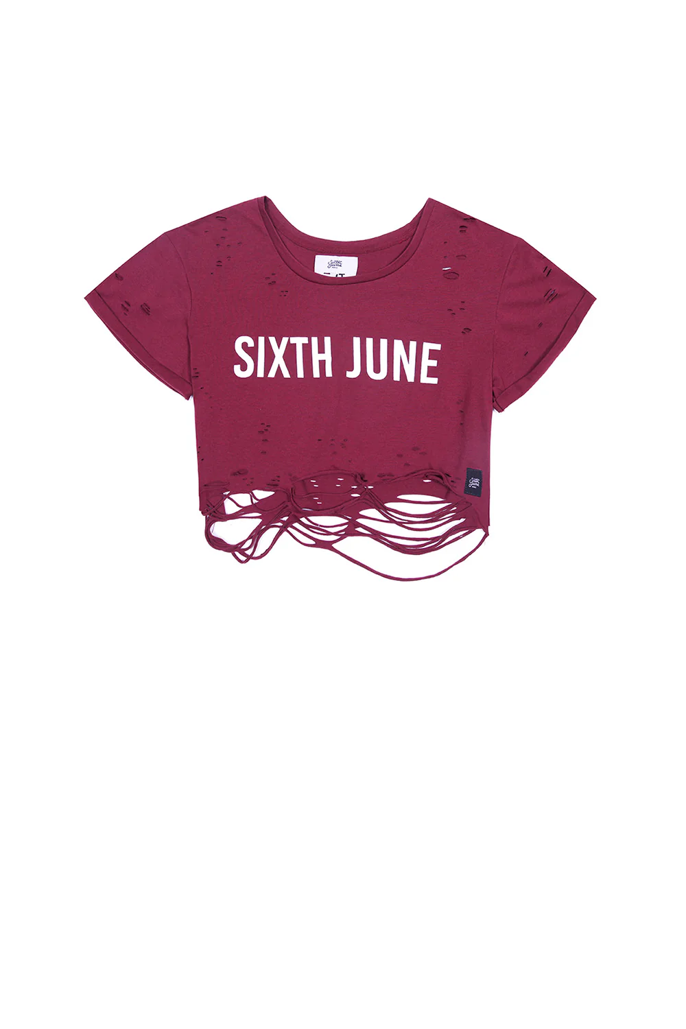 T-shirt court bordeaux Sixth June Femme. Collection Activewear. Effet destroy. Modèle crop top. Inscription Sixth June à l’avant.