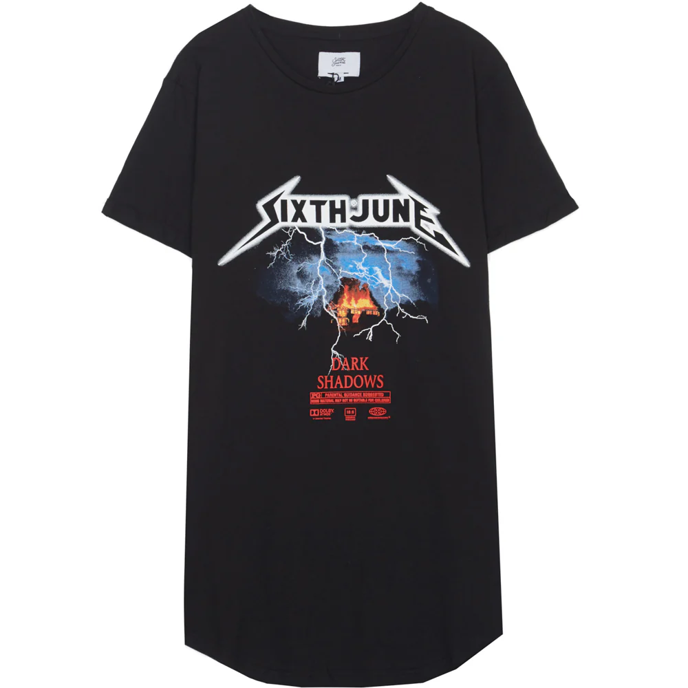 T-shirt Sixth June pour homme avec « Sixth June » imprimé façon hard rock. Coupe droite, base arrondie, col rond, manches courtes et imprimé film d’horreur (maison qui brûle, éclairs). Modèle noir.