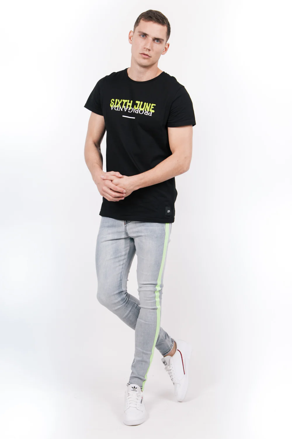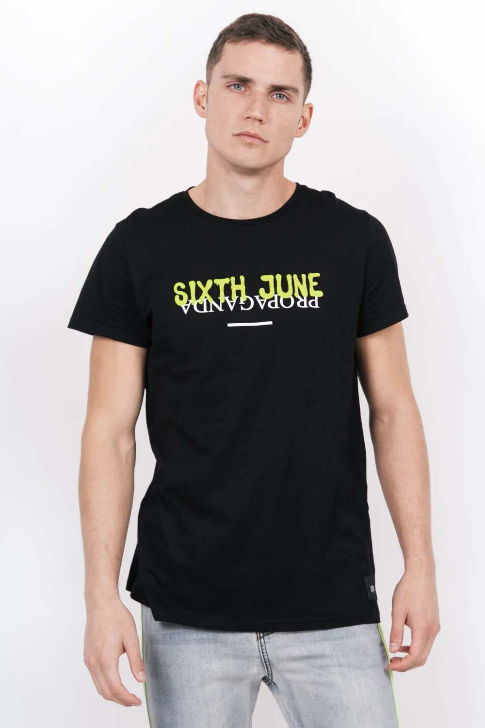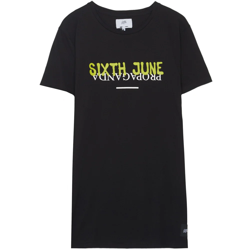 T-shirt Sixth June pour homme avec Propaganda imprimé à l’envers et « Sixth June » imprimé au dessus façon graffiti. Coupe droite (légèrement plus longue et large qu’un T-shirt classique), col rond et manches courtes. Modèle noir avec logo fluo.