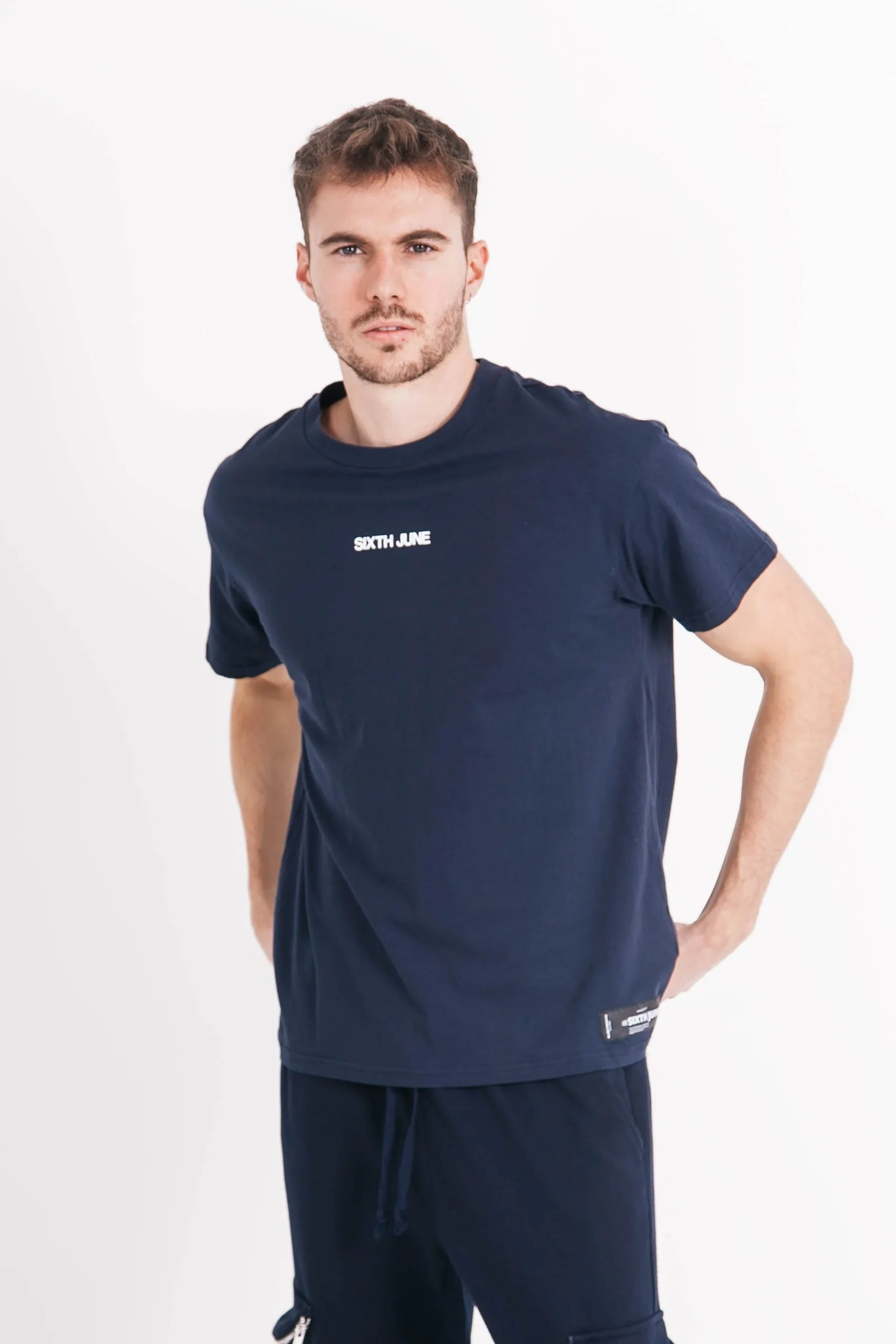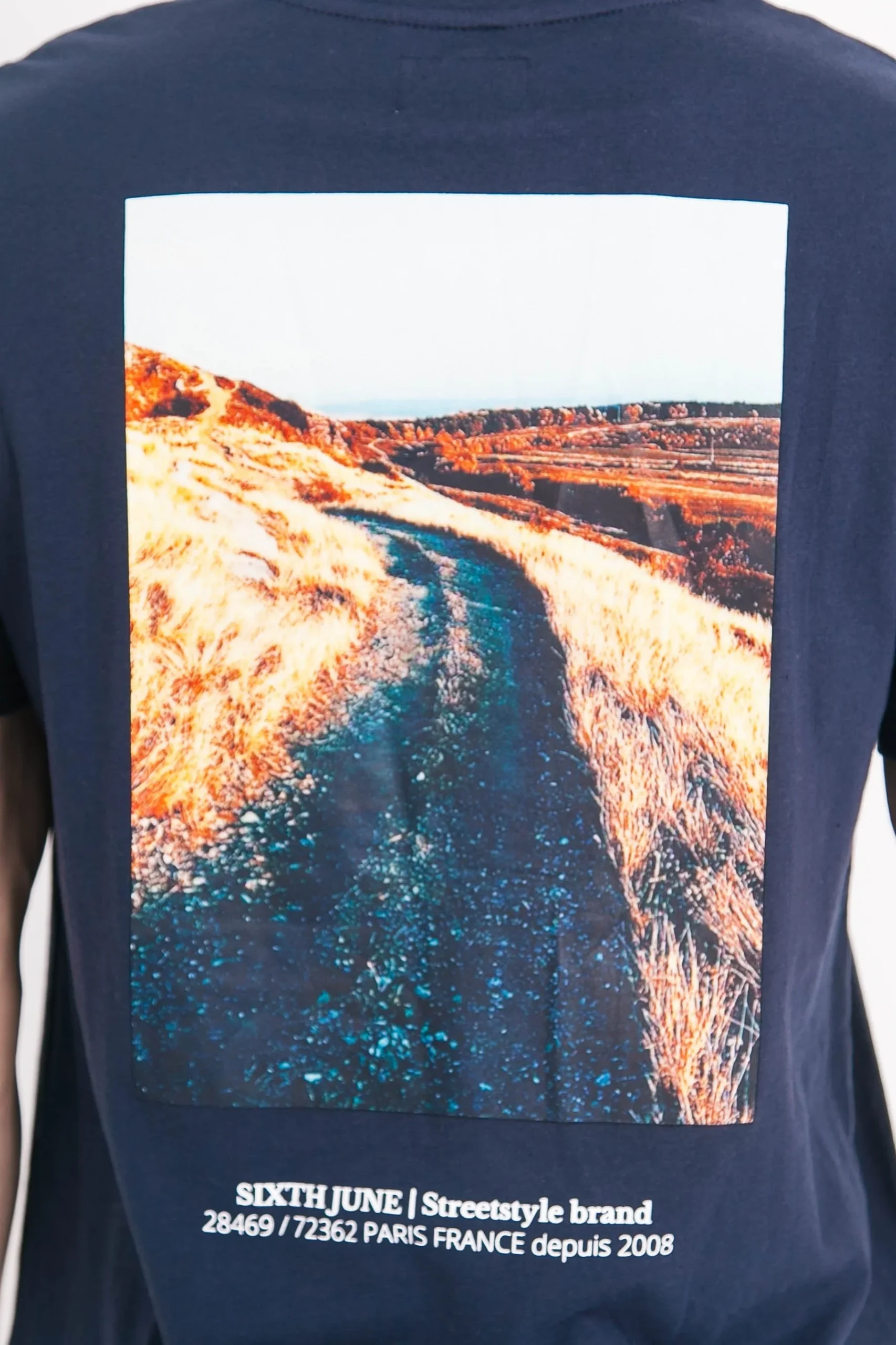 T-shirt manches courtes pour homme de marque Sixth June. Grande photo d’un désert à l’arrière. Sixth June inscrit à l’avant. Coupe classique. Modèle bleu marine.
