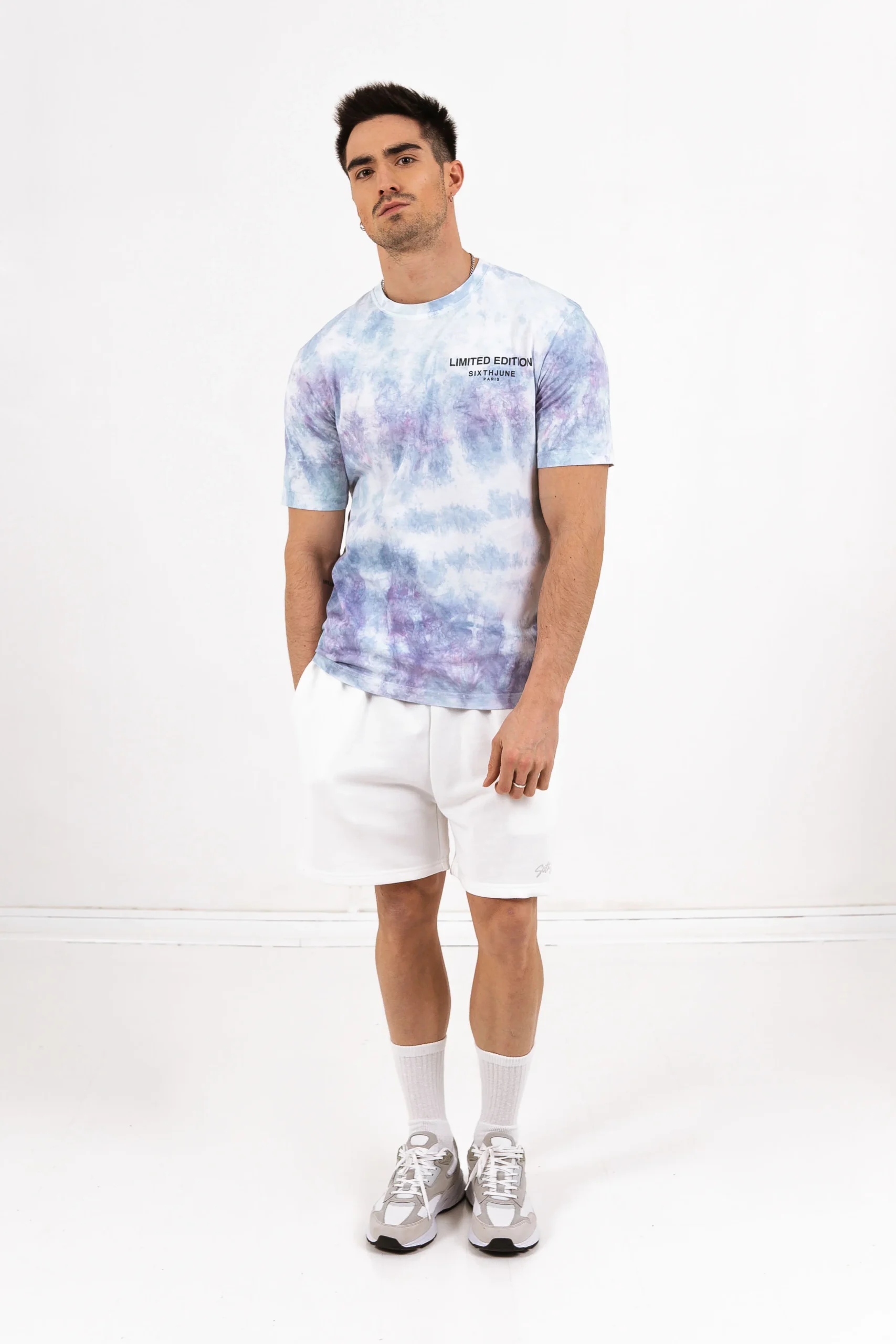 T-shirt pour homme de marque Sixth June. Imprimé tie and dye, dégradé de plusieurs couleurs sur l’ensemble du tissu. Inscription limited edition à l’avant avec autres textes. Coupe classique. Modèle bleu/vert.