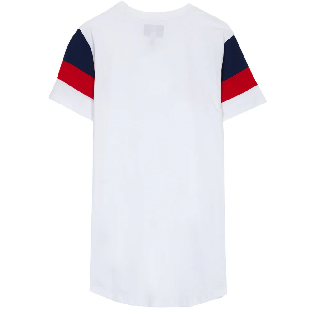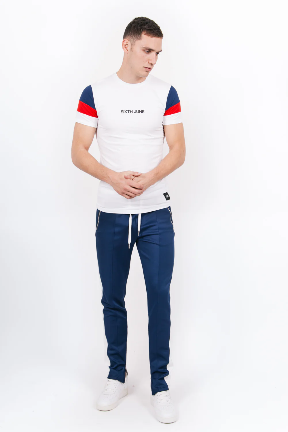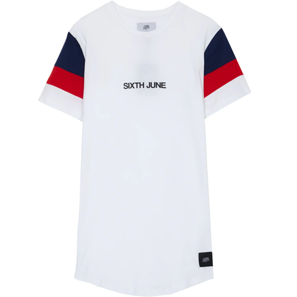 T-shirt Sixth June pour homme avec des manches courtes tricolores. Coupe moulante, « Sixth June » imprimé à l’avant, col ronds et base légèrement arrondie. Modèle blanc, rouge et bleu marine.