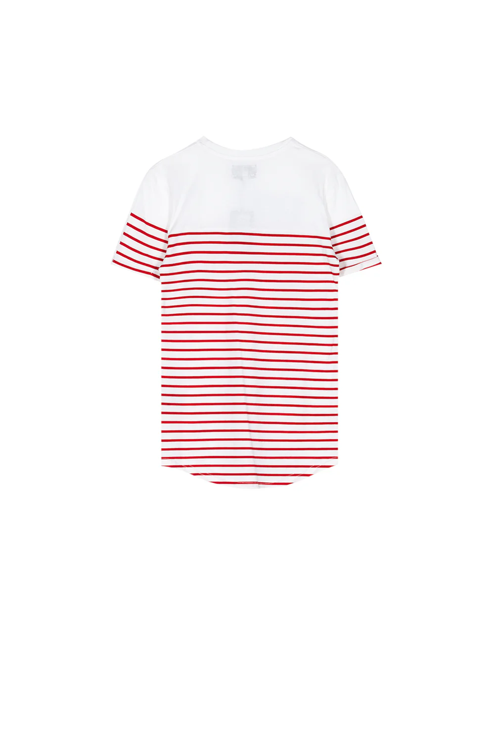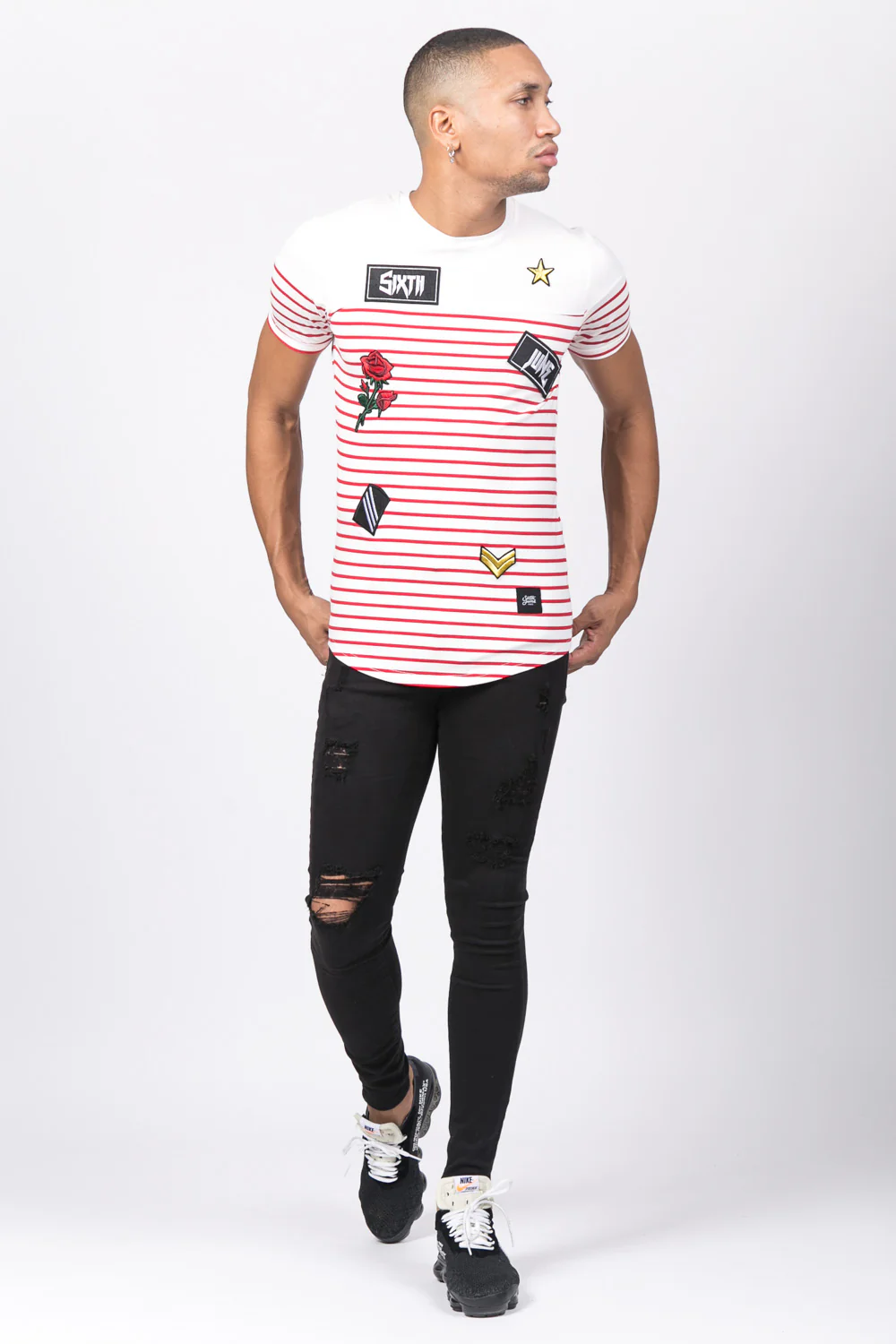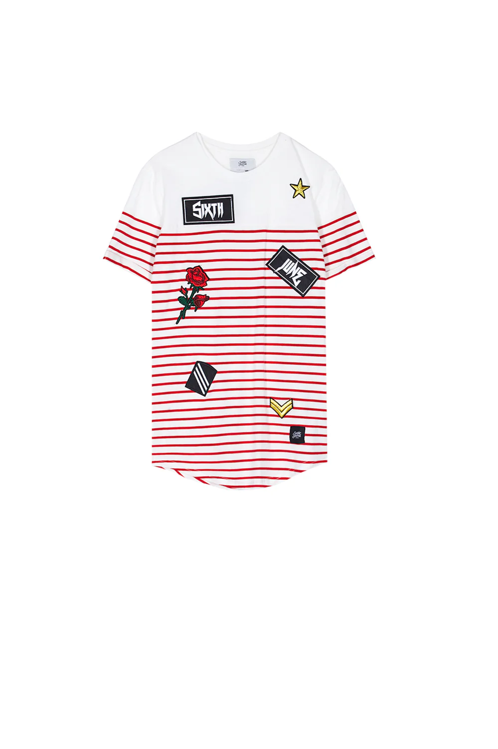 T-shirt homme Sixth June type marinière avec plusieurs patchs : étoile, rose, logo gothique. Coupe ajustée et petit ourlet au niveau des manches. Modèle blanc avec des rayures rouges.