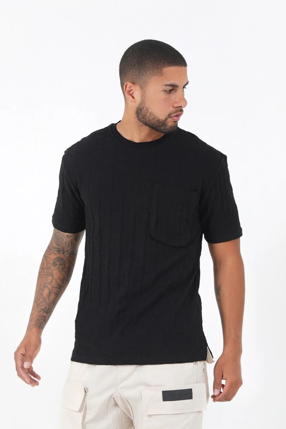 T-shirt à manches courtes pour homme de marque Sixth June. Inspiration tissu Jacquard avec le monogramme SJ tissé directement dans la matière. Poche à l’avant. Coupe classique. Modèle noir.