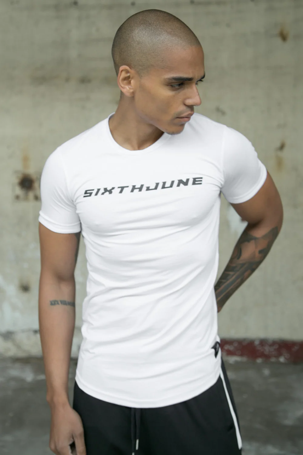 T-shirt Sixth June Homme avec une coupe moulante, et un logo à l’avant type racing. Modèle blanc.