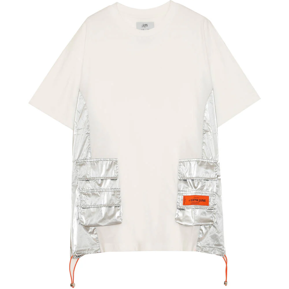 T-shirt à manches courtes pour homme de marque Sixth June. Multiples poches et empiècements en matière brillante. Cordons de serrage à la taille et patch colorés. Coupe large. Modèle blanc, gris et orange.