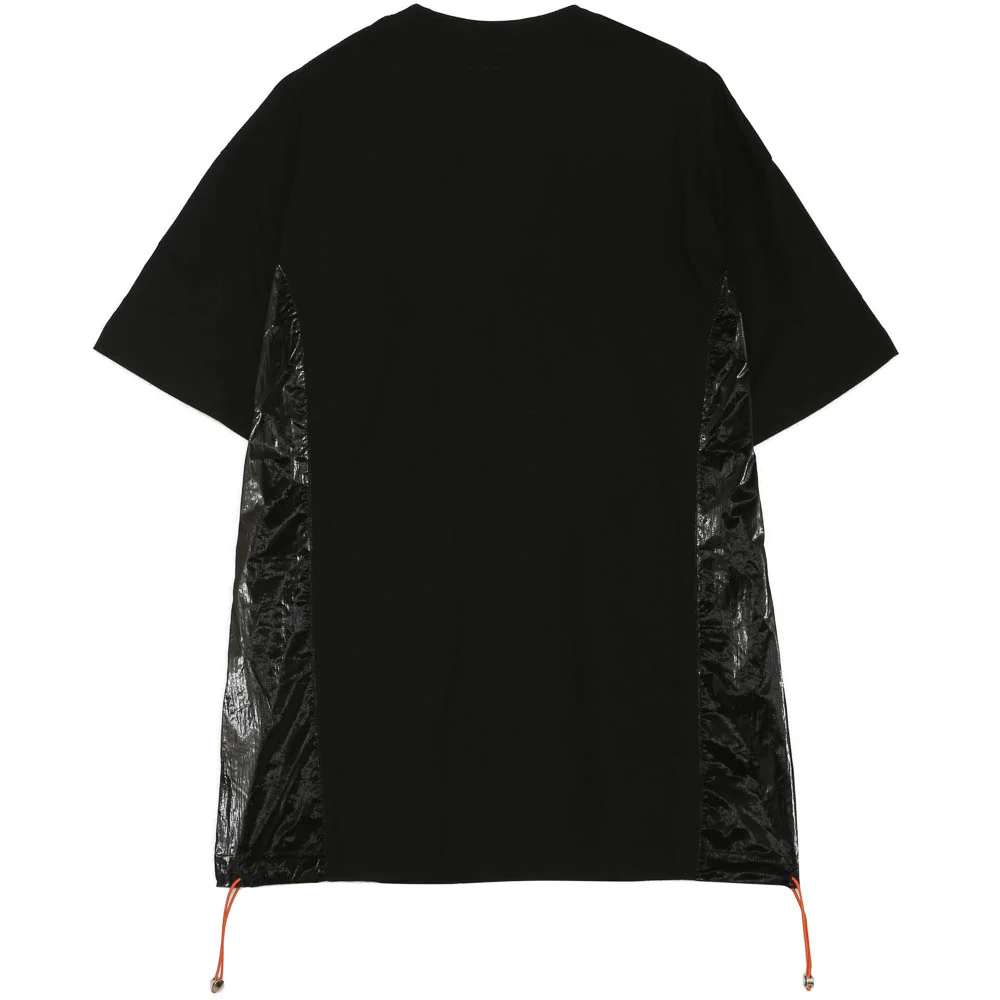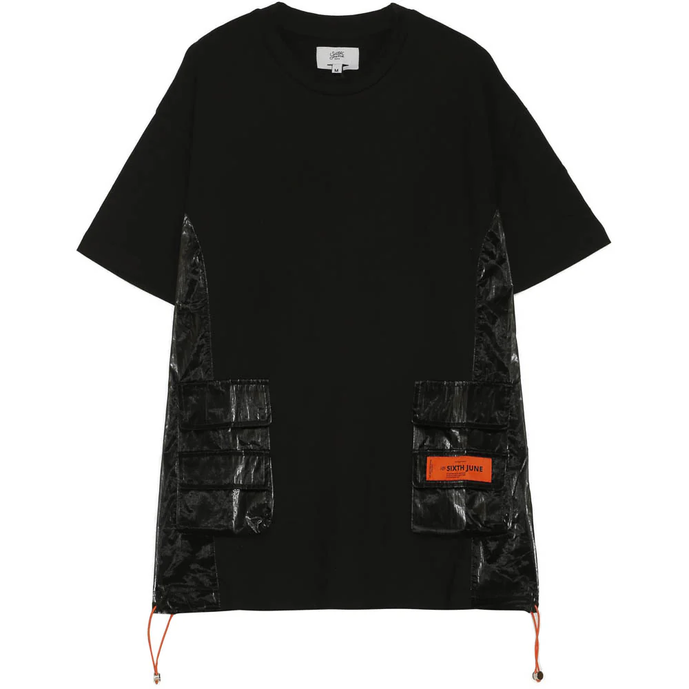 T-shirt à manches courtes pour homme de marque Sixth June. Multiples poches et empiècements en matière brillante. Cordons de serrage à la taille et patch colorés. Coupe large. Modèle noir et orange.