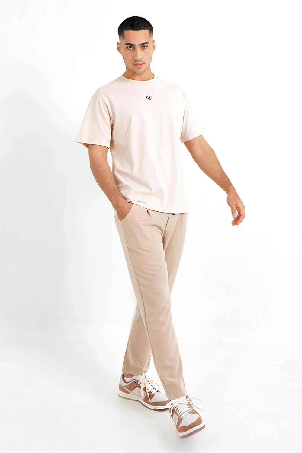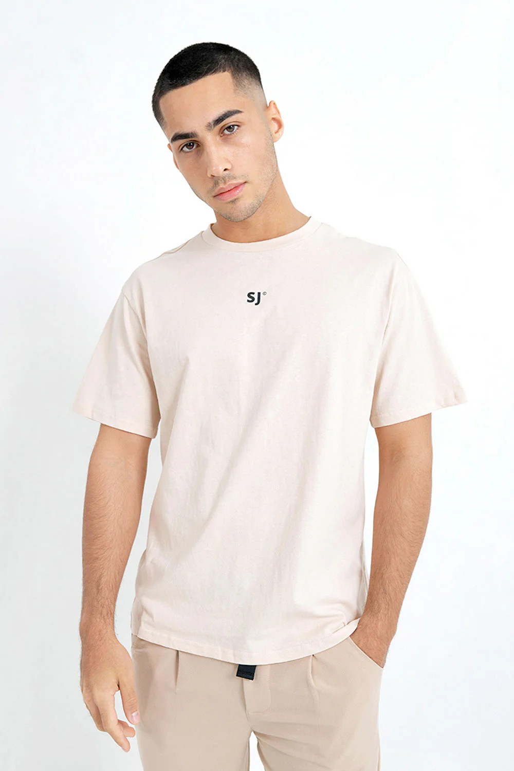 T-shirt pour homme de marque Sixth June. Image d’un coucher de soleil sous les tropiques imprimée à l’arrière avec textes en dessous. Monogramme SJ inscrit à l’avant. Coupe classique, épaules tombantes. Modèle Beige.
