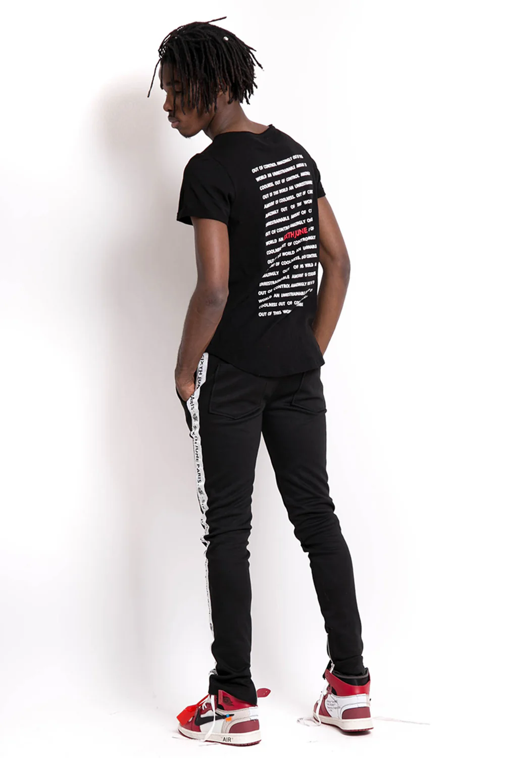 T-shirt homme Sixth June avec un grand imprimé texte à l’arrière : Out of control amazingly out of this world. Modèle noir.