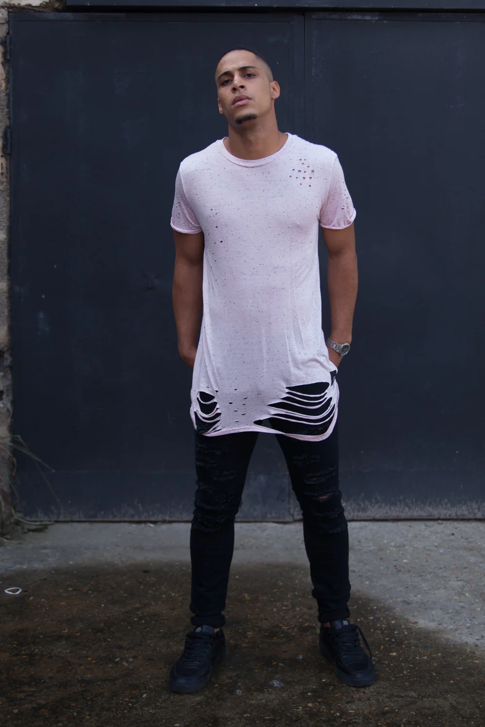 T-shirt moucheté rose Sixth June Homme. Destroy à l’avant et à l’arrière. Coupe oversize.