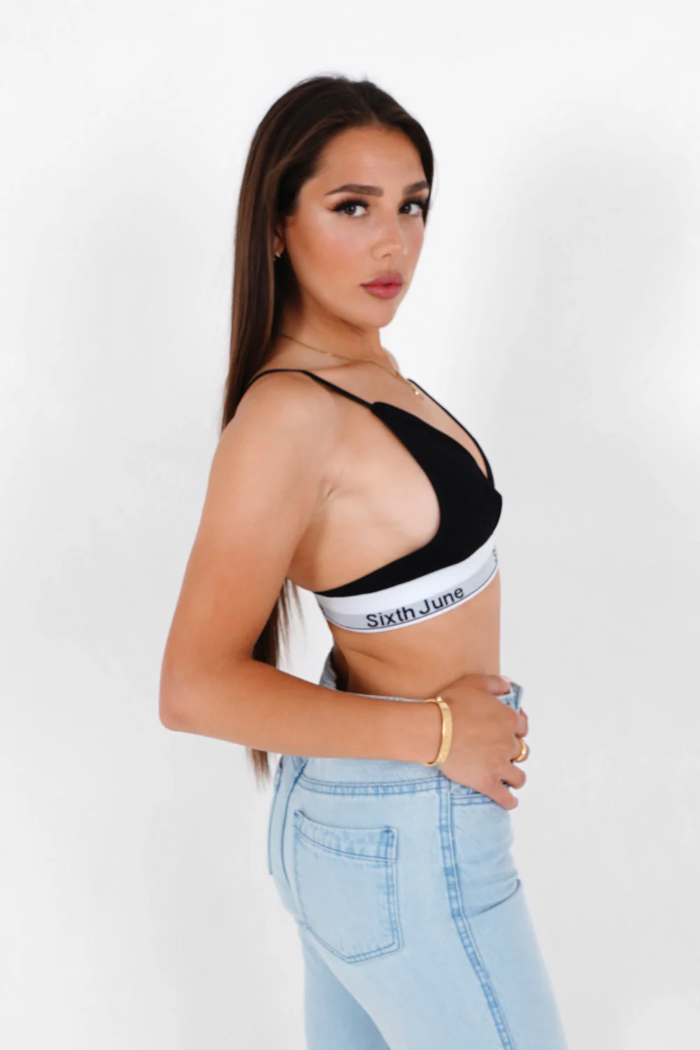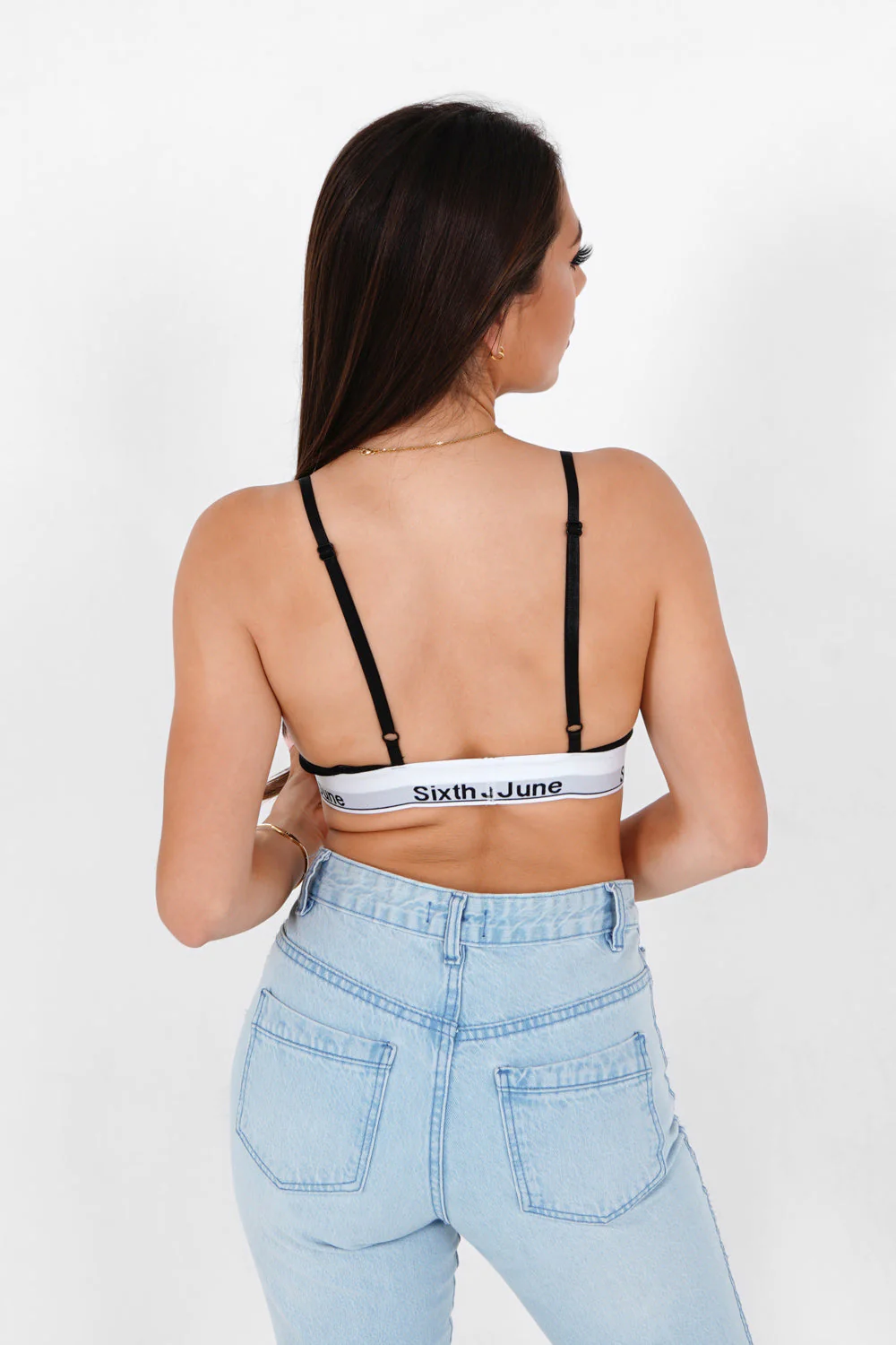 Brassière pour femme de marque Sixth June. Brassière échancrée à bretelles fines et ajustables. Bande élastique avec inscription SIXTH JUNE à l’envers. Coupe classique.