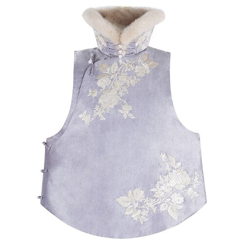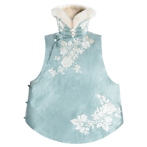 Ce qui rend cette veste si spéciale, c’est sa capacité à mêler des touches orientales avec un esprit très contemporain. Le col mandarin, emblème de la mode chinoise, ajoute une allure distinguée. Les broderies florales – délicatement posées – évoquent un printemps éternel même quand la neige tombe.